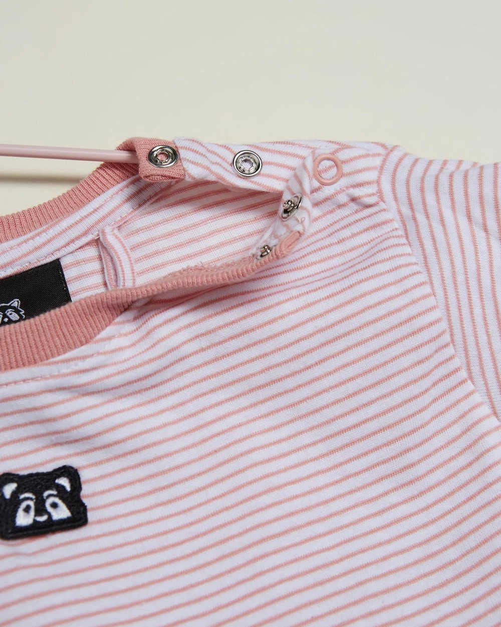 – Crew neck t-shirt; snaps at shoulder for easy changing