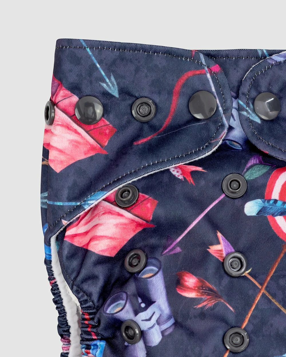 – One Size Fits Most – suitable from newborn, through to toilet training (3.5kg-15+kg, depending on individual body shape)- All-in two nappy providing 3 rise settings for adjustable fit- Australian owned and designed for over a decade- Exclusive custom-designed hand illustrated prints. – Nappy contains two tri-layer inserts; a smaller snap-in insert and a long anchor shaped insert- A pocket opening at the back for additional boosting – Inserts: Custom milled bamboo/cotton inserts with vegan suede topper to draw moisture away from skin- Cover: PUL (polyurethane laminate) outer, which keeps moisture from leaking through