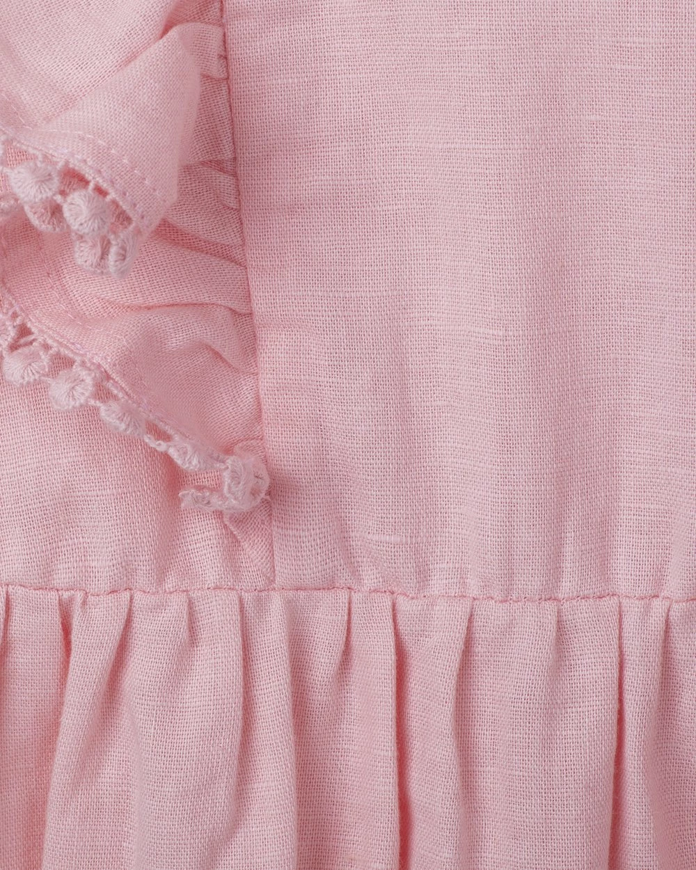 The Olivia S/S Linen Ruffle Romper from Designer Kidz features shoulder frill with pom pom trims, elasticised leg cuffs, gathering at the waist, and three-button opening at the back. Designer Kidz is an Australian owned special occasion wear label.