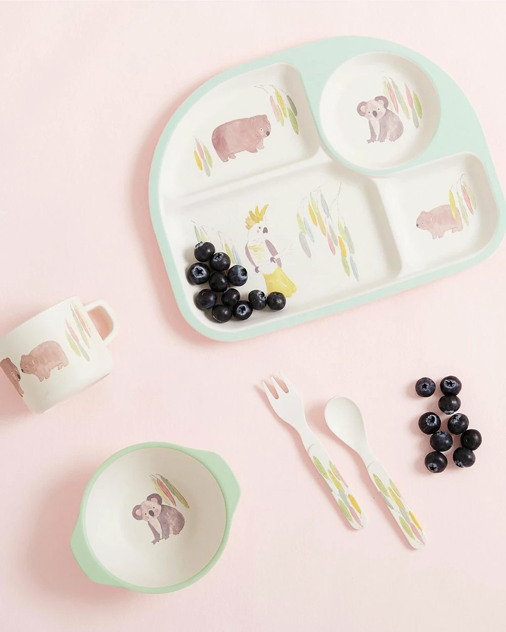The Purebaby Dinnerware Set is a sweet way to start their journey into solid foods, with a four-section plate accompanied by a handled cup, bowl, spoon and fork.