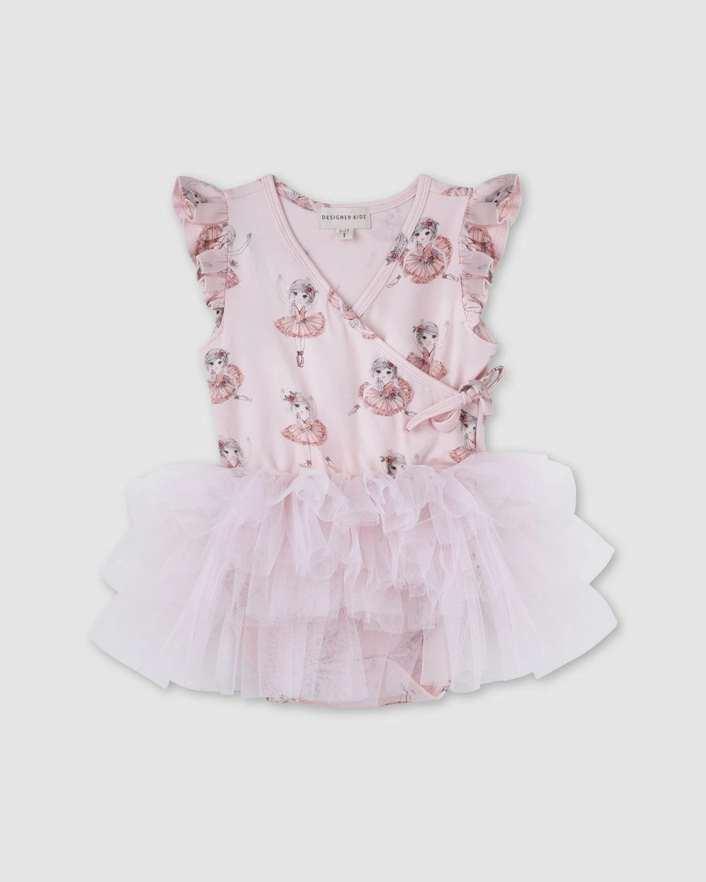 The Ballerina S/S Tutu Wrap Romper from Designer Kidz features a vibrant ballerina print, wrap top with shoulder ruffle detail, and layered tulle tutu skirt. Designer Kidz is an Australian owned special occasion wear label.