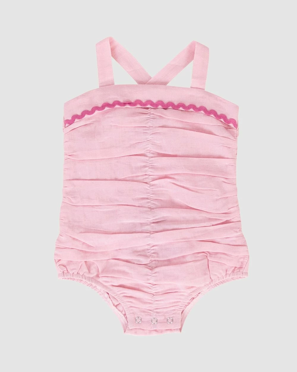 With a pretty fairyfloss pink and snaps to fasten, Peggy‘s delightful Isla Playsuit is perfect for sunny days out.