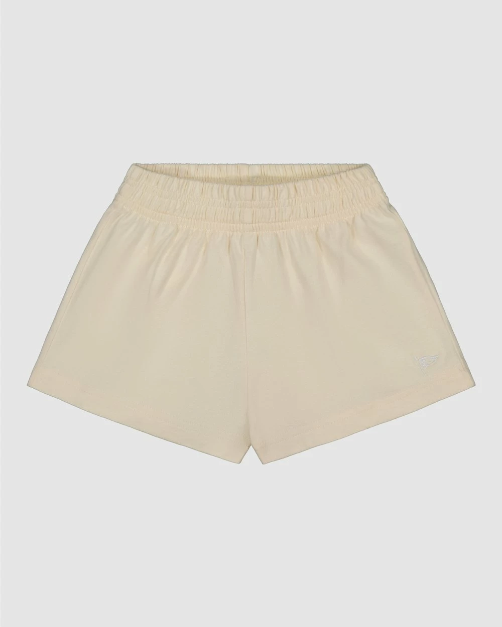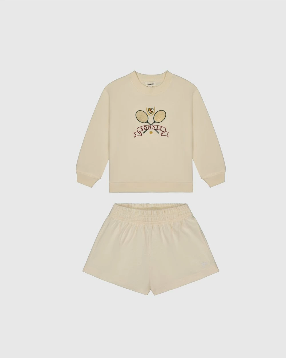The Sonnie Crest Crewneck Sweatshirt and Charlie Shorts set in buttercream. Cut in 100% GOTS certified organic cotton with limited edition tennis crest embroidery on the crewneck and signature Sonnie flag embroidery on the shorts.