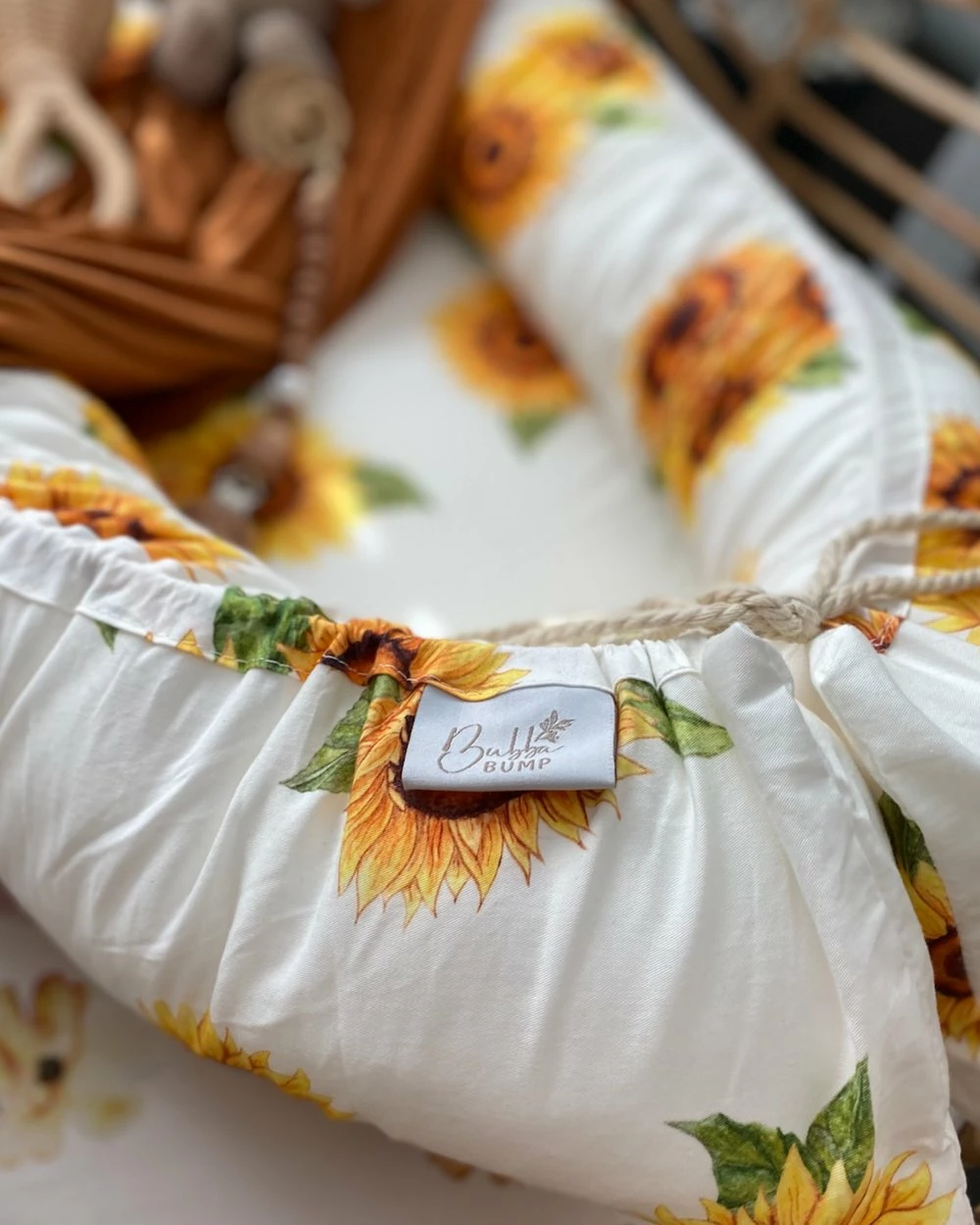 – Dimensions: H80cm x W50cm- Made from organic cotton- Cushioned mattress- Internal drawstring; adjust size and fit to suit; convert from a lounge to a nest– Convenient carry handles to top and side