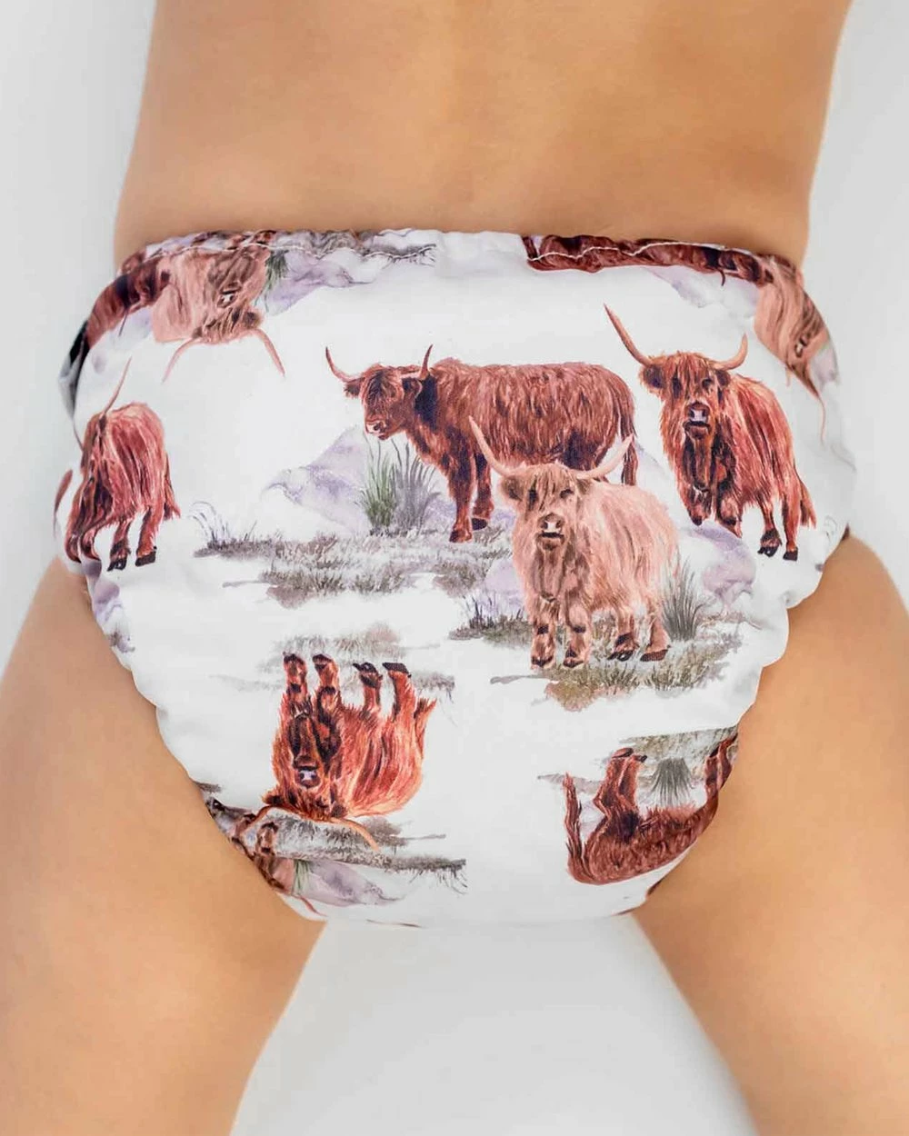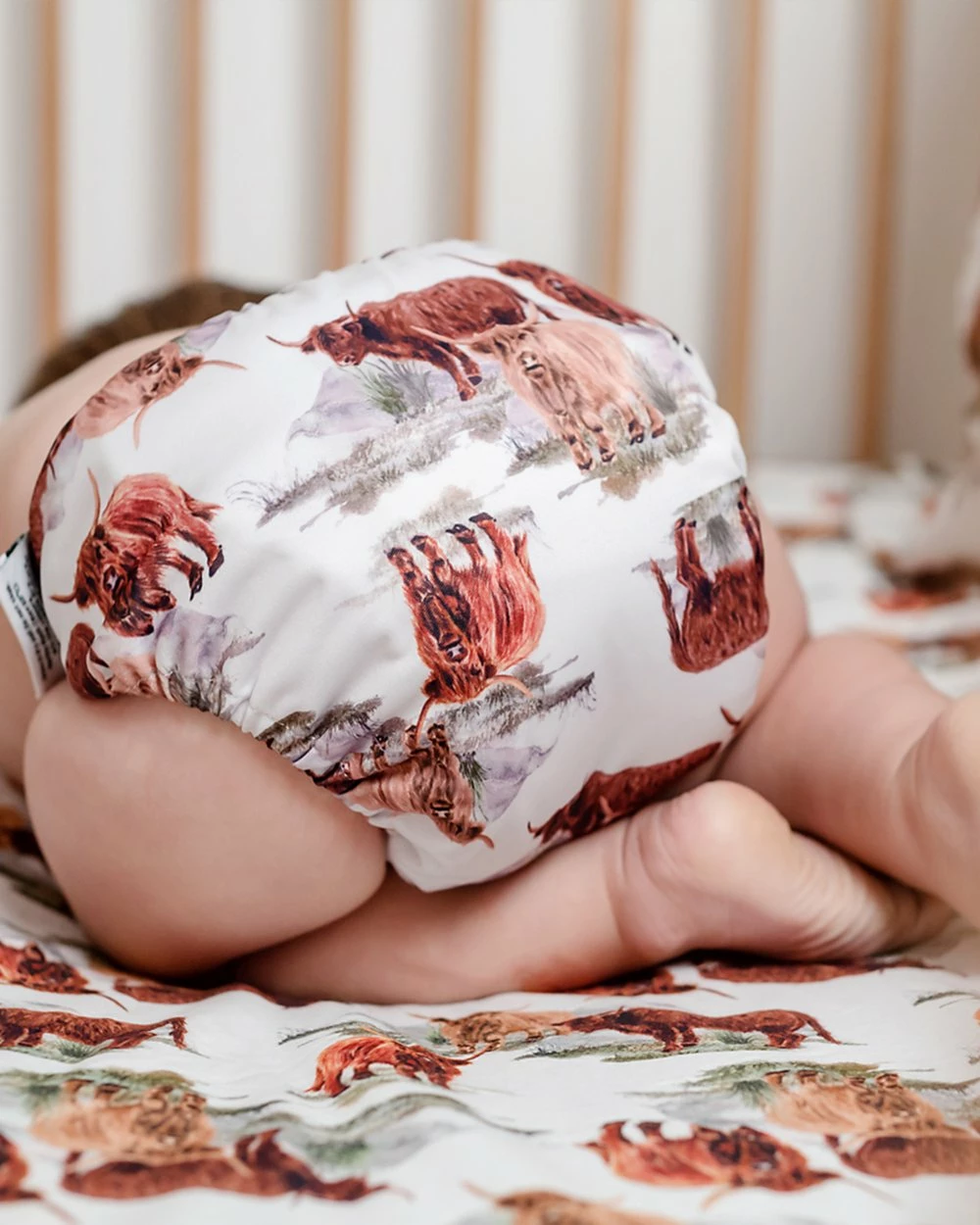 – One Size Fits Most – suitable from newborn, through to toilet training (3.5kg-15+kg, depending on individual body shape)- All-in two nappy providing 3 rise settings for adjustable fit- Australian owned and designed for over a decade- Exclusive custom-designed hand illustrated prints. – Nappy contains two tri-layer inserts; a smaller snap-in insert and a long anchor shaped insert- A pocket opening at the back for additional boosting – Inserts: Custom milled bamboo/cotton inserts with vegan suede topper to draw moisture away from skin- Cover: PUL (polyurethane laminate) outer, which keeps moisture from leaking through