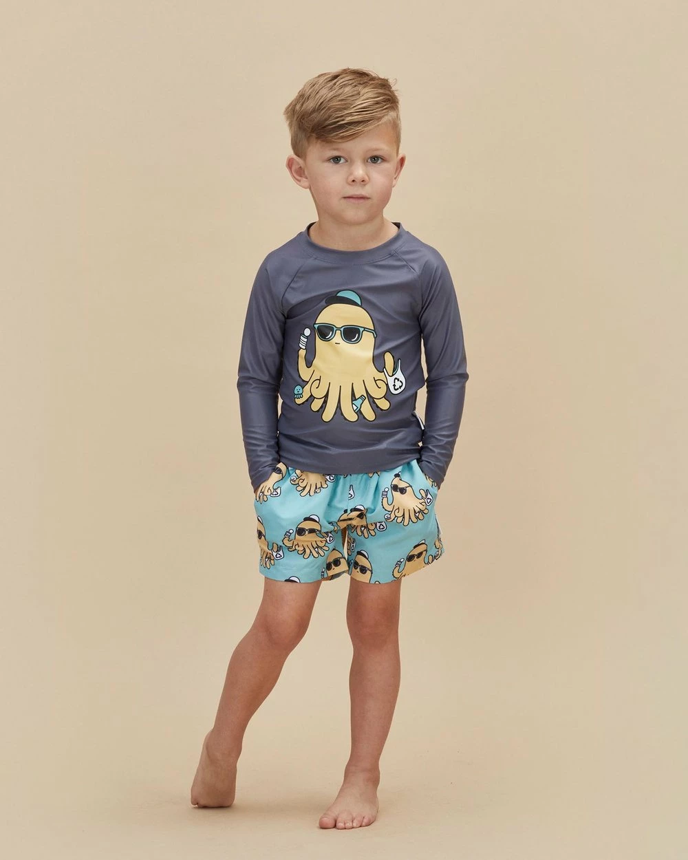 – Quick-drying recycled polyester swim fabric; stretch