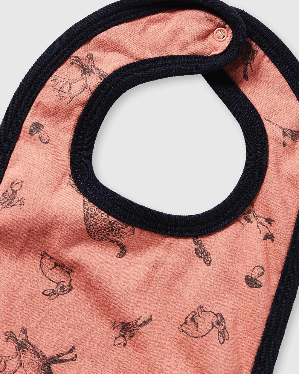 Made from comfortable cotton jersey, the Woodland Bib by Milky offers a playful woodland-inspired print atop a brick-hued base.
