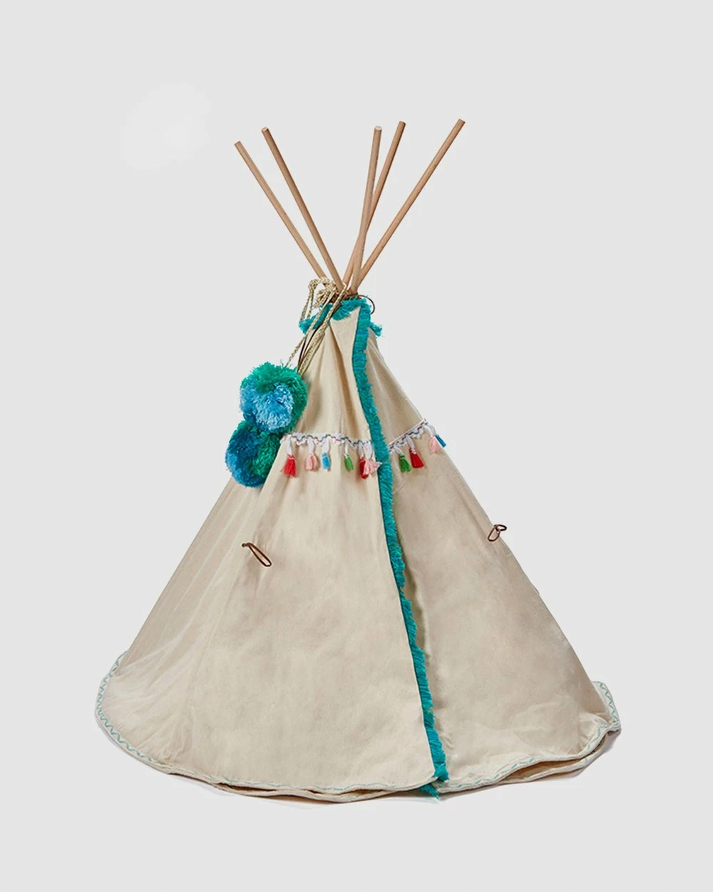 The Nana Huchy Doll’s Teepee is the perfect addition to any playroom with its fun pompom-trimmed canvas tent and simple tie-back entrance.