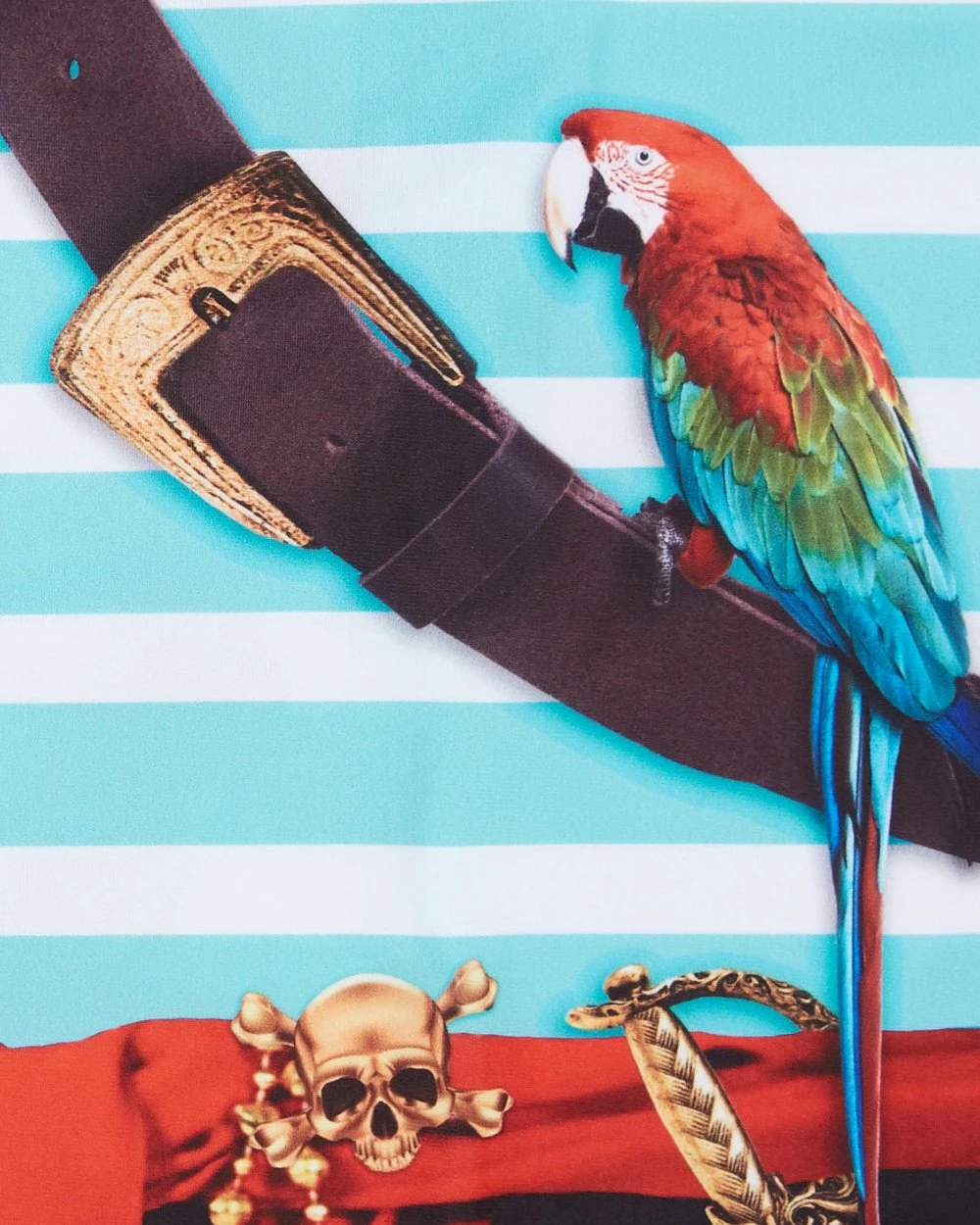 – Turquoise and white stripes; black, scarlet red, green, blue and orange pirate print