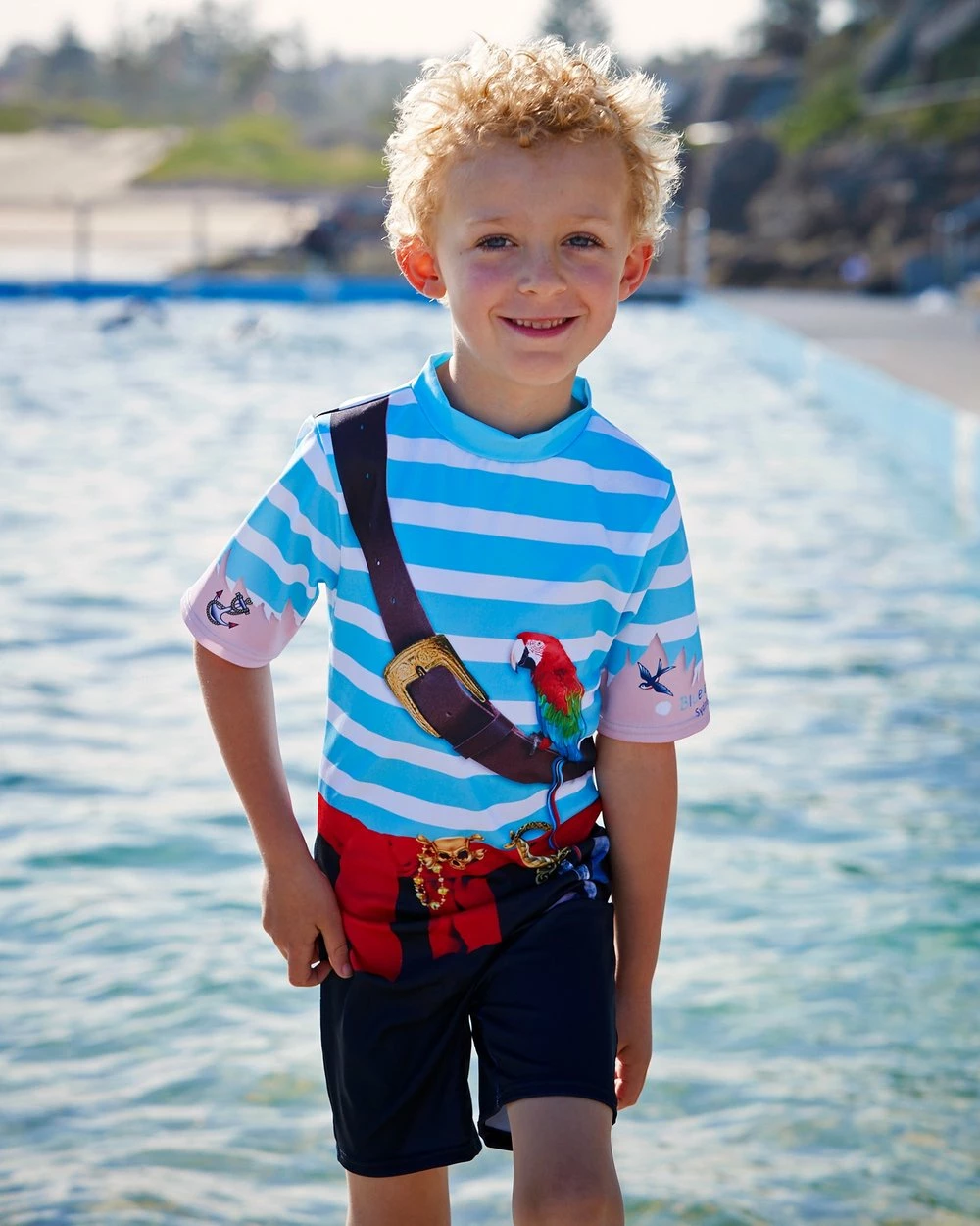 The Pirate Rash Suit by Sydney-based children's swimwear label Bluesalt Beachwear is perfect for beach or poolside fun. Complete with an fun pirate print, the rash suit is shaped with a high neckline and short sleeves. Crafted from chlorine-resistant fabric, it is designed with UPF50+ protection to ensure your little one can splash around while keeping well protected from the sun.