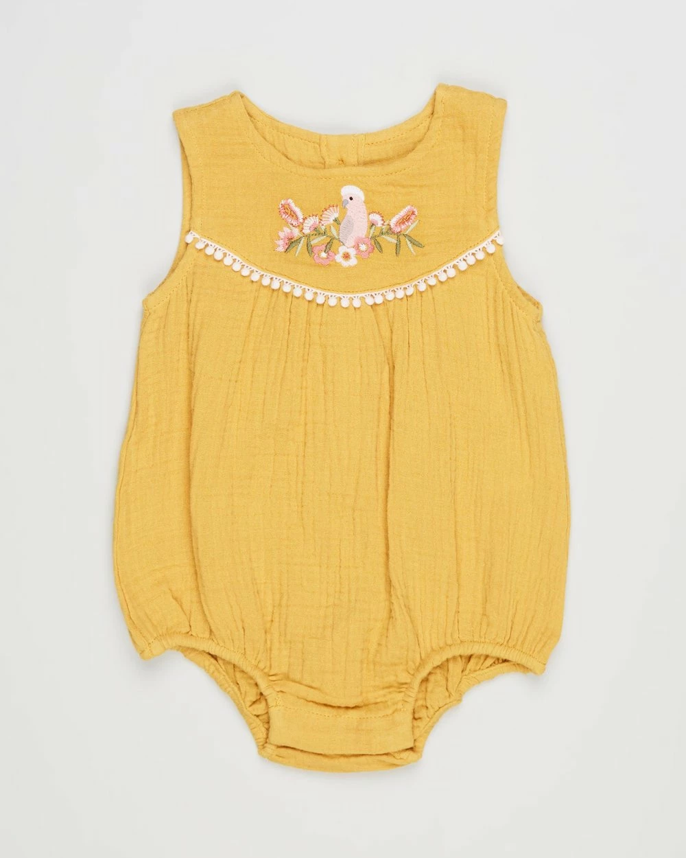 – Galah floral embroidery detail to chest; pom-pom trim