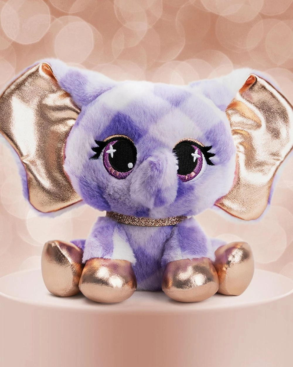 Start your P*Lushes Pets collection with the fashionable Ella L’Phante and her geometric-patterned fur, sparkling amethyst-toned eyes, shining rose gold-toned ears, hooves and matching glitter collar.