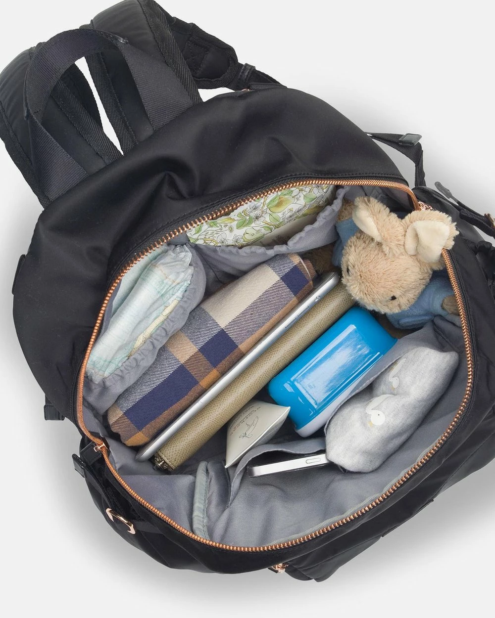 – The lower compartment has its own zipped opening and a waterproof lining – ideal for storing breast pumps or gym and swim gear.