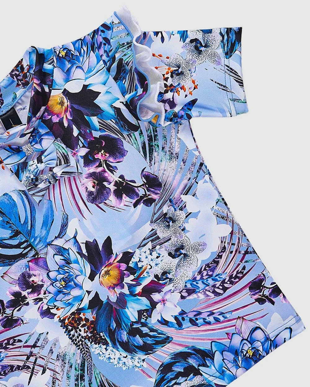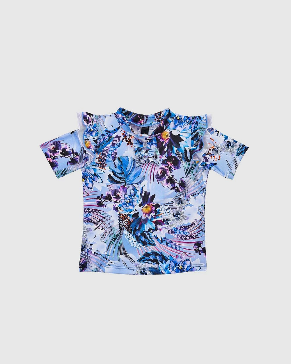 Bring a burst of colour to their budding swimwear collection with the Iris Flutter Short Sleeve Rash Vest from Aqua Blu Kids.
