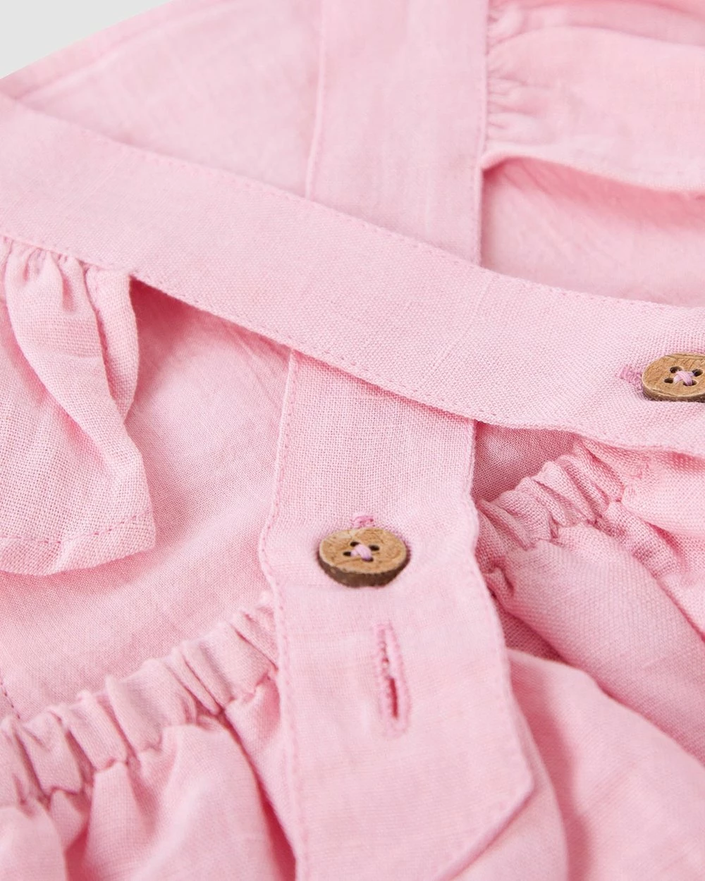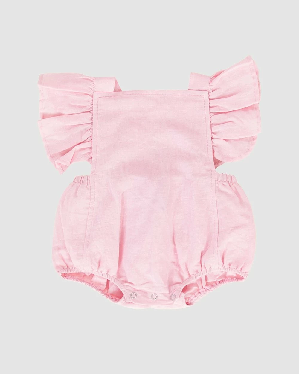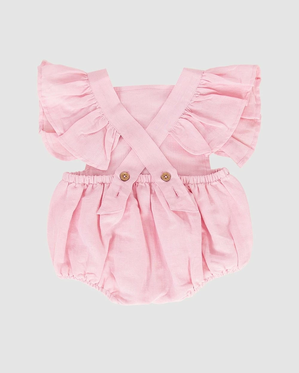 With delicate frills finished in pure cotton and snaps to fasten, Peggy‘s delightful Catherine Playsuit is ready for sunny days out.