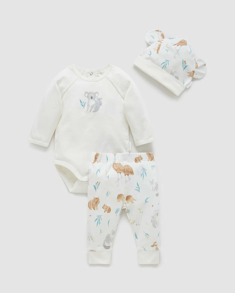 Purebaby’s 3 piece gift pack, thoughtfully designed for great gift ideas, is a part of their lovely Australiana range. Consisting of a long sleeve bodysuit with a koala illustration at the chest, a native animal print legging and a matching print hat.
