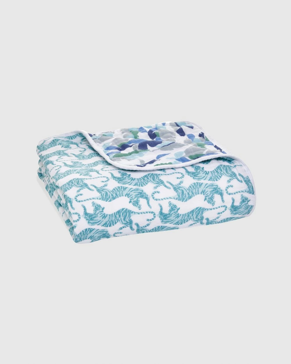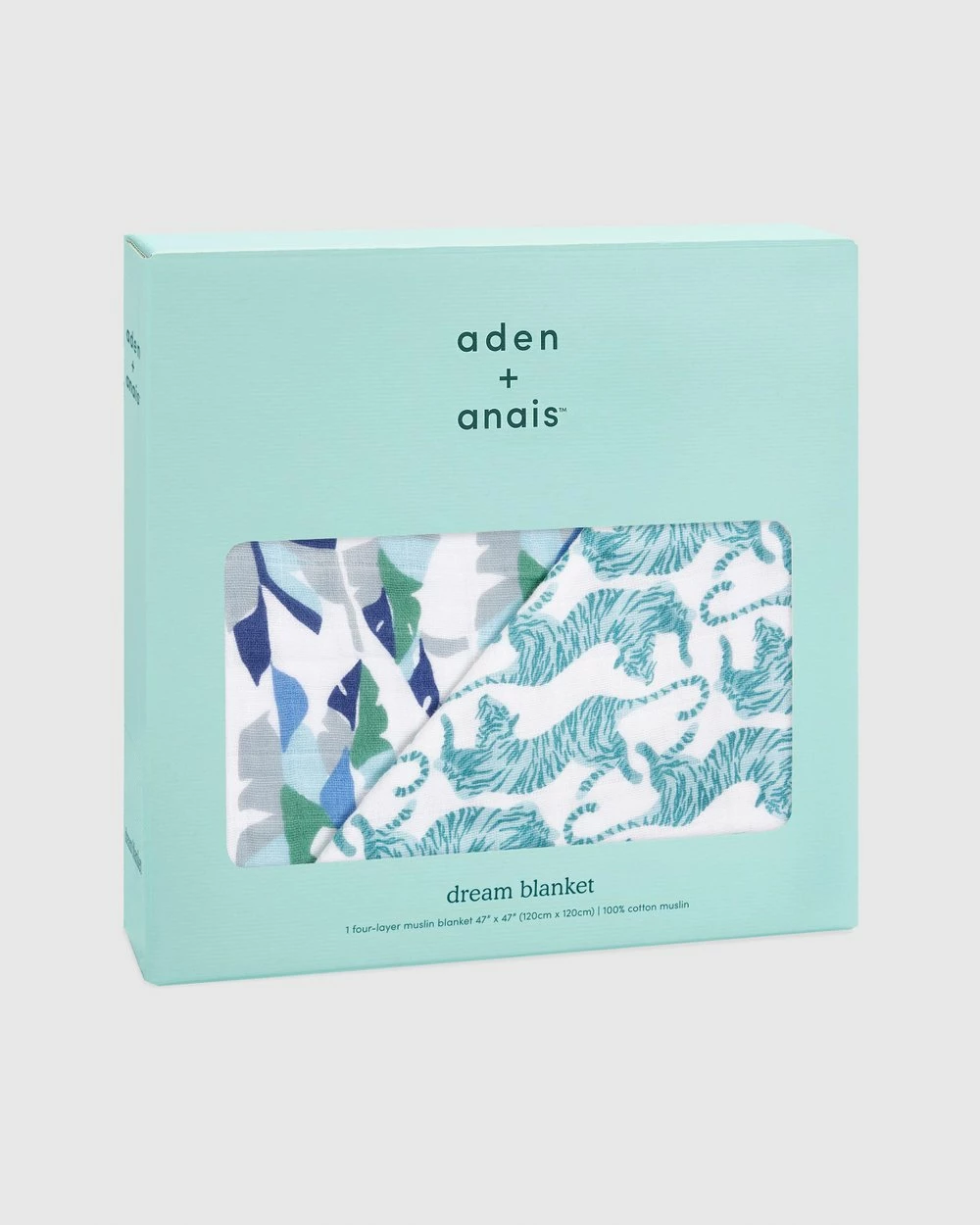 The Classic Dream Blanket by Aden & Anais is thoughtfully crafted from quadruple-layered soft cotton muslin and features a jungle-inspired dancing tiger print.