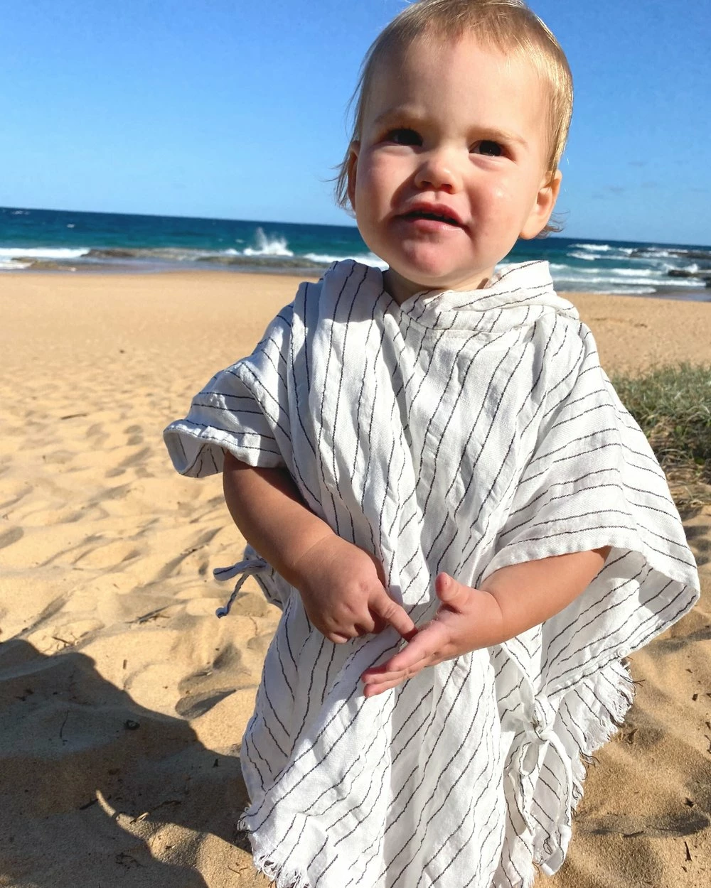 – Made with 100% premium linen cotton- Fits sizes 1 – 4 years (W60cm x H50cm)- Ties at the side to create arms- Light-weight and absorbent – Comes with a linen drawstring bag- Available in 4 colours