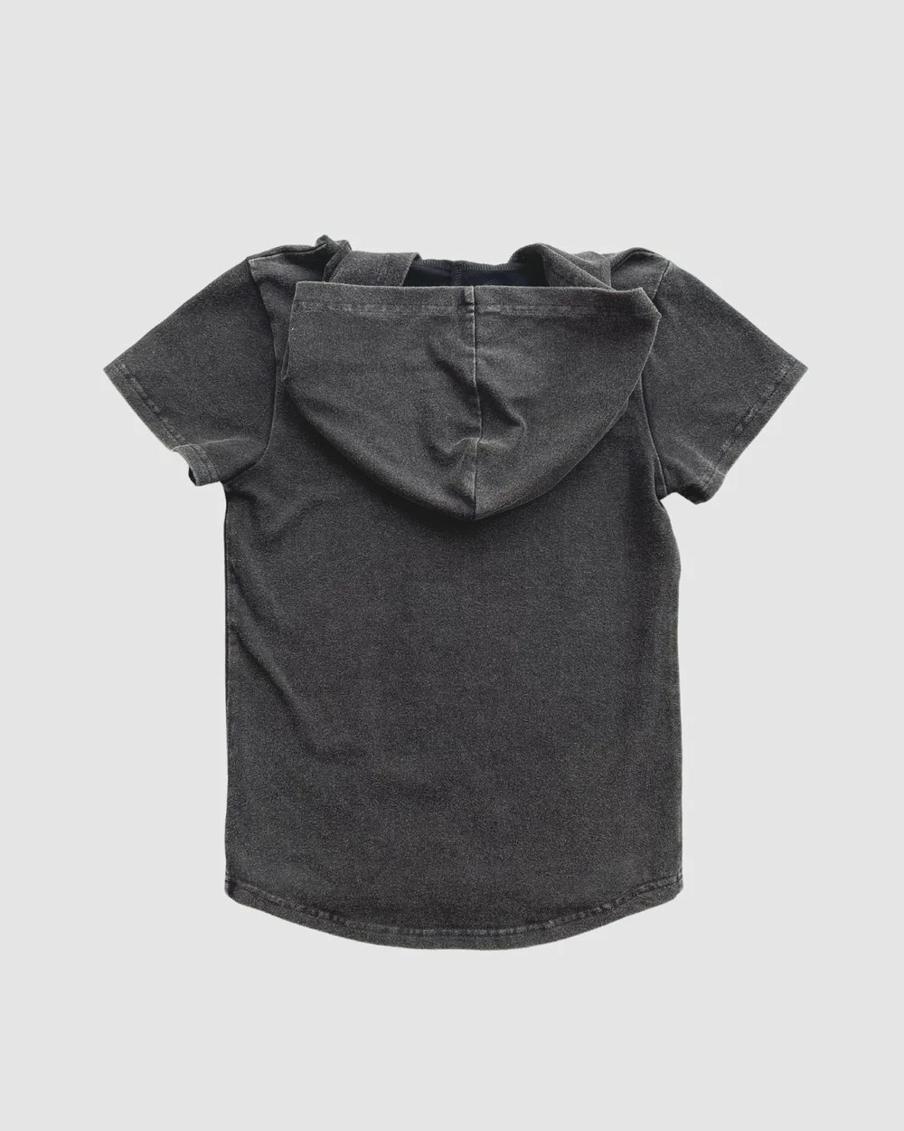 – Black Acid Wash Hooded Tee with Single Placement Artwork