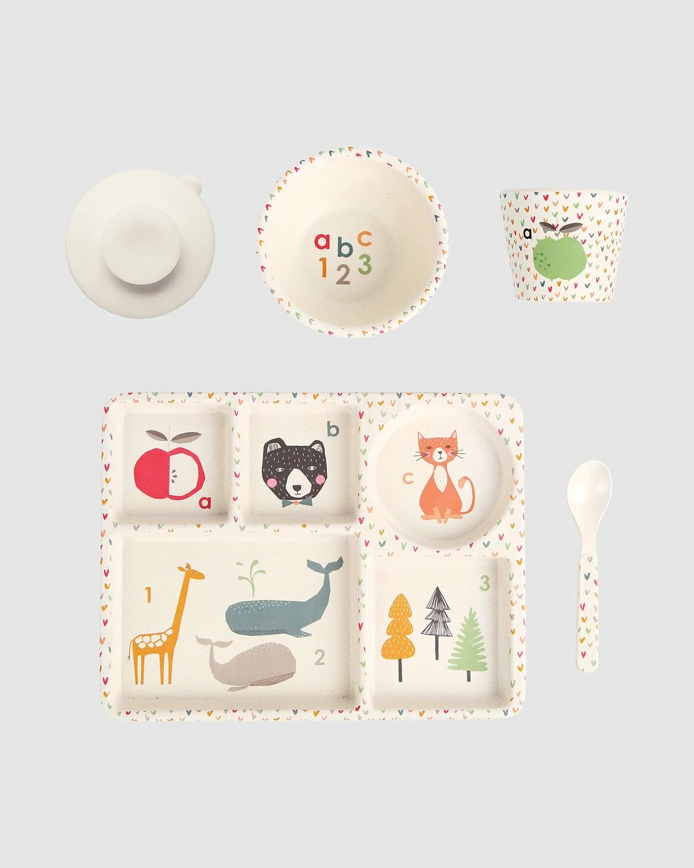 – 5 sectioned divided plate 21 x 27cm- Small Bowl – 13.5 x 11.5 x 5cm (perfect size for little ones)- Mini Tumbler – 6.5 cm- Spoon 13.5cm long- Suction cap- Made from plant fibres including bamboo and corn starch- Dishwasher safe – BPA, Phthalates and toxin free