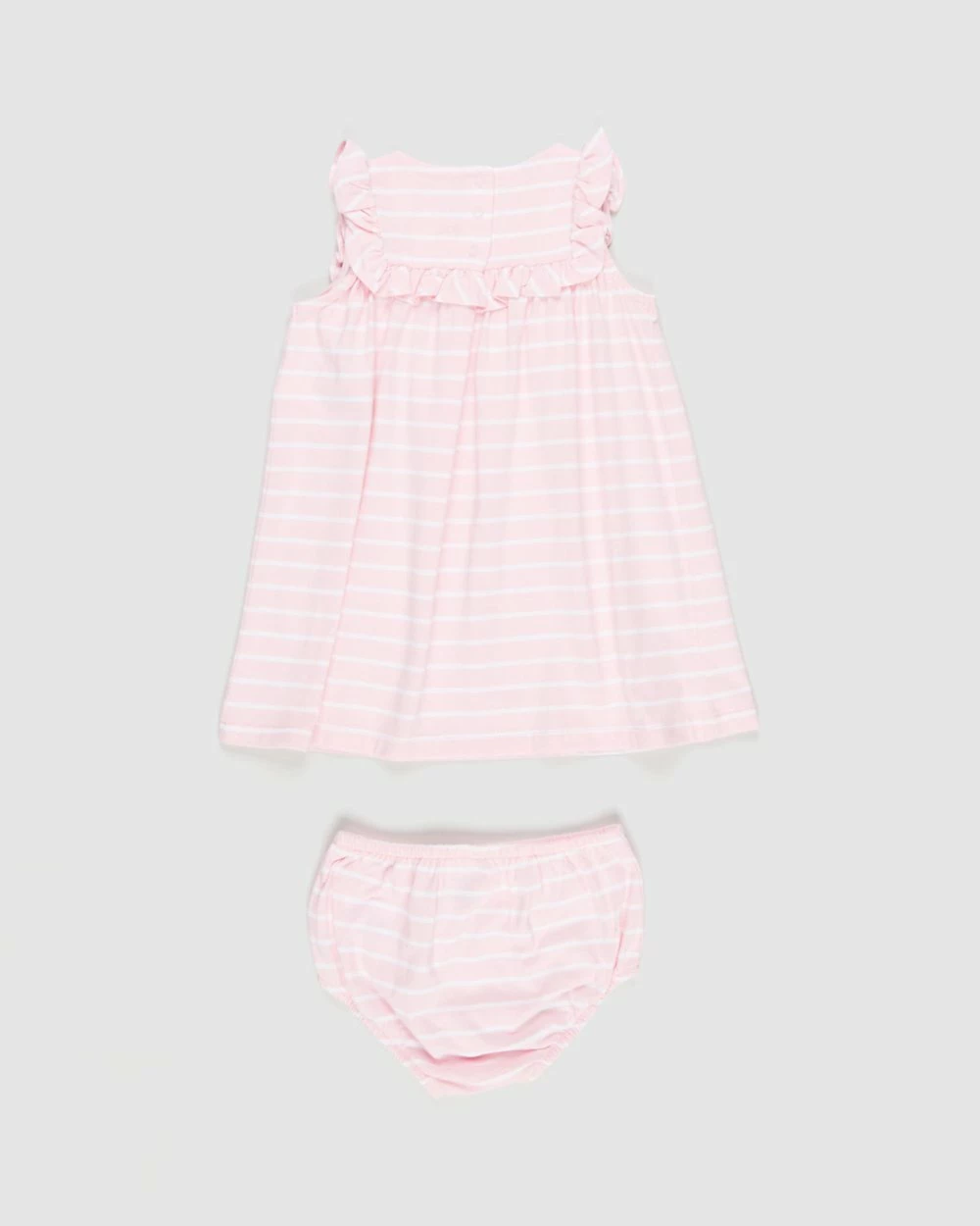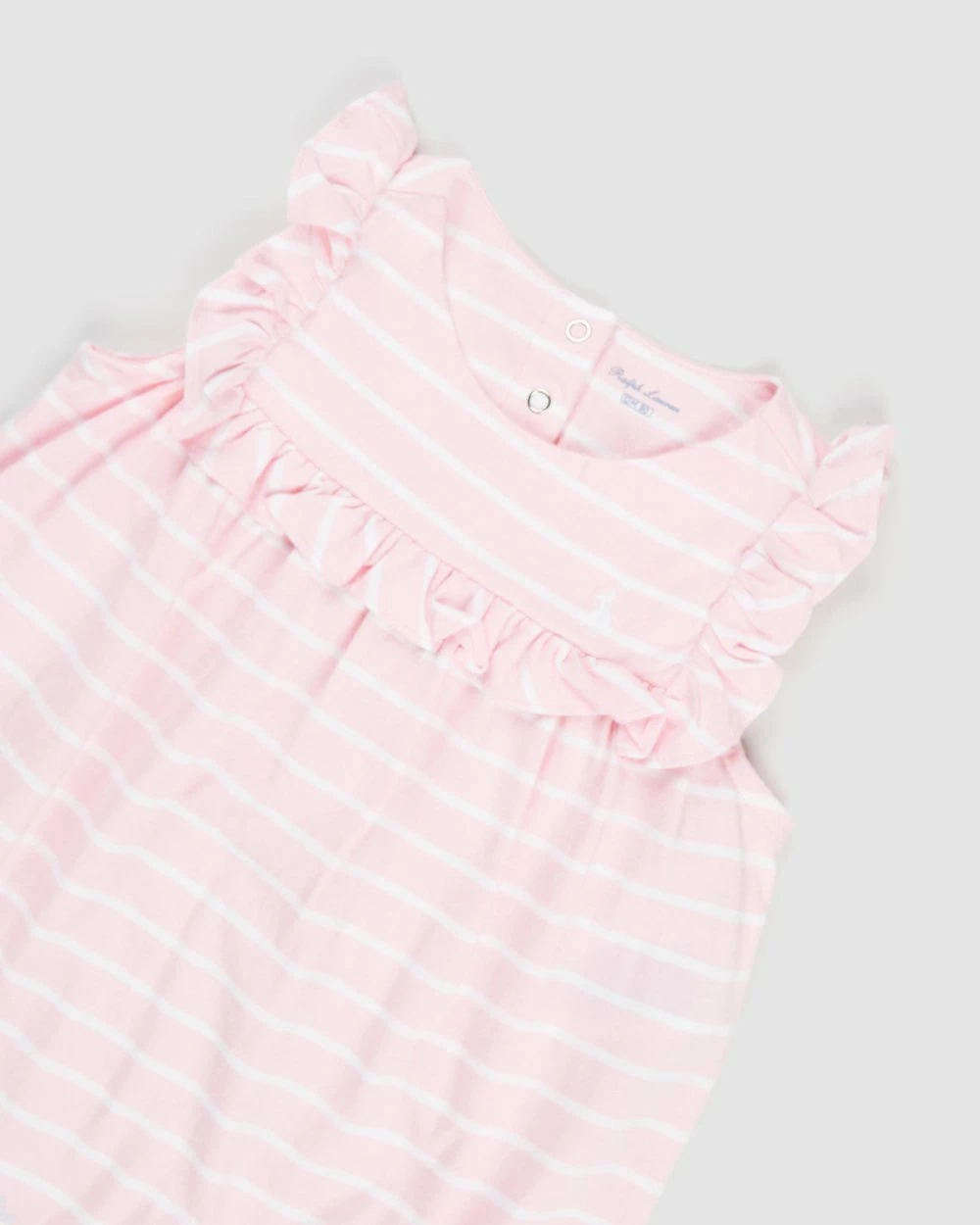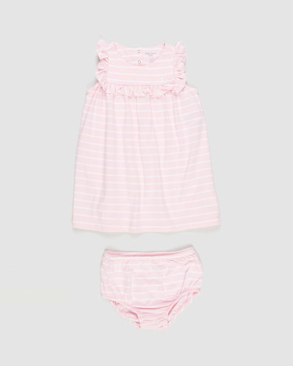 The Striped Cotton Dress with Bloomer Set from Polo Ralph Lauren offers a sweet striped detail with ruffle trims for summer playdates.