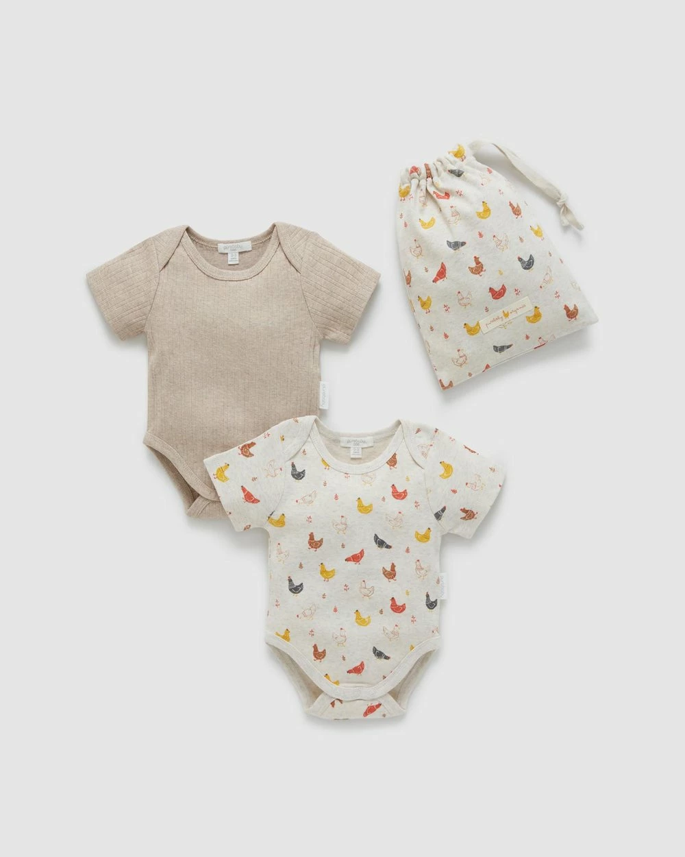 The 2-Pack Bodysuit pack from Purebaby is an essential piece and perfect for laying all year round. One suit is printed with the gorgeous little chooks print and the second suit is designed in a neutral taupe with ribbing. The 2-Pack Bodysuit is packaged in a lovely Purebaby bag.
