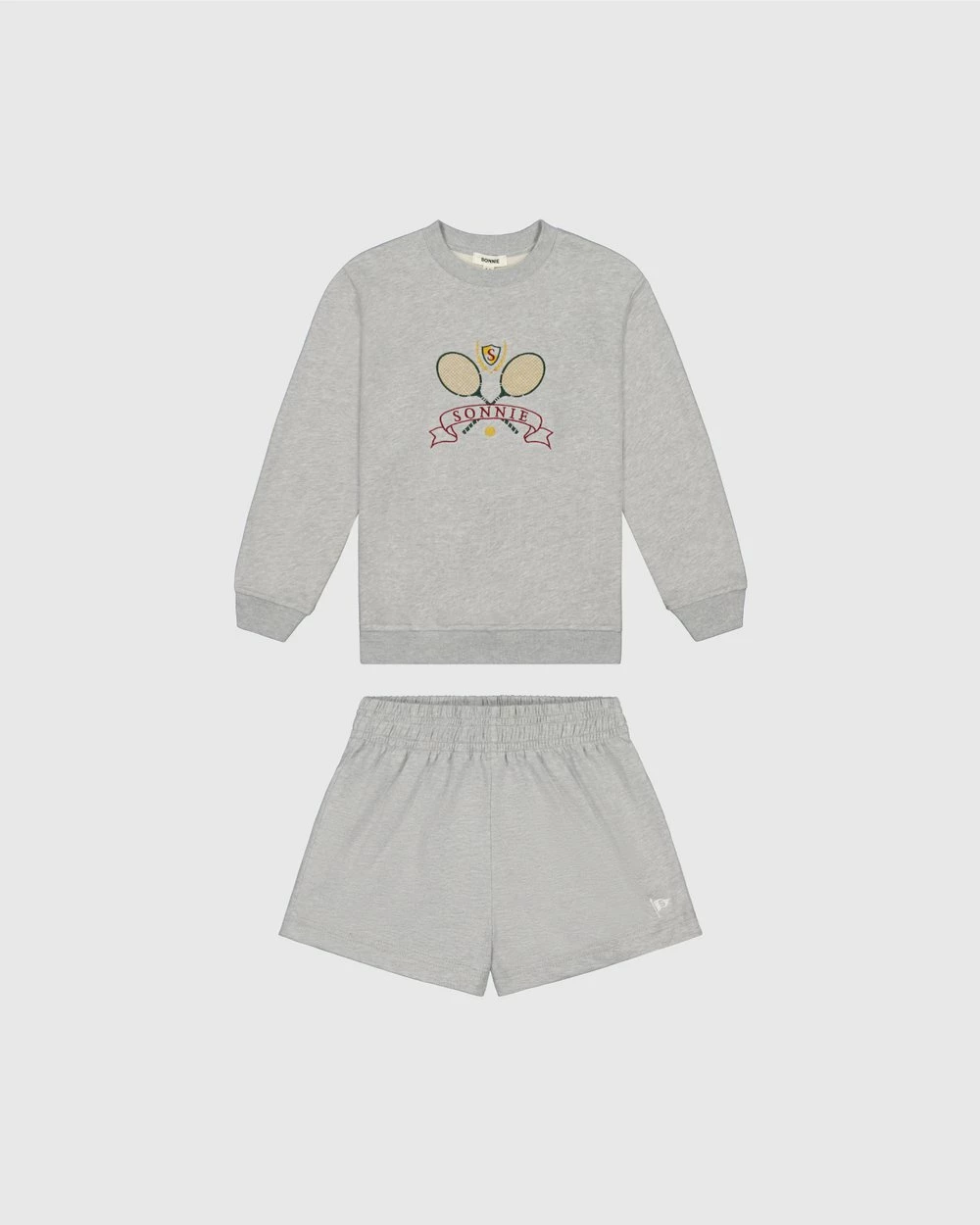 The Crest Crewneck Sweatshirt and Charlie Shorts set in grey marle. Cut in 100% GOTS certified organic cotton with limited edition tennis crest embroidery on the crewneck and signature Sonnie flag embroidery on the shorts.