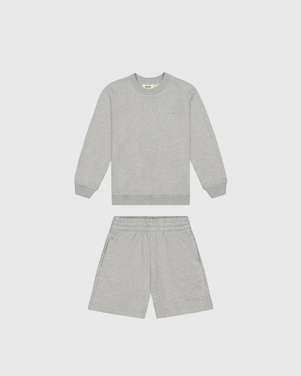Sonnie’s 100% GOTS certified organic cotton Tama Crewneck Sweatshirt and Earl Sweat Shorts set in grey marle.