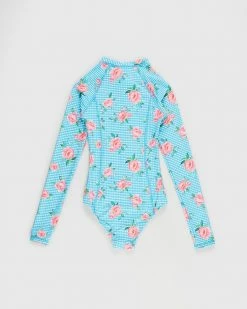Buy ❤️ Bluesalt Beachwear Holiday Girl – Long Sleeve Surf 🩱 Swimsuit with Beach Hat – Kids Aqua And White Gingham 🎉