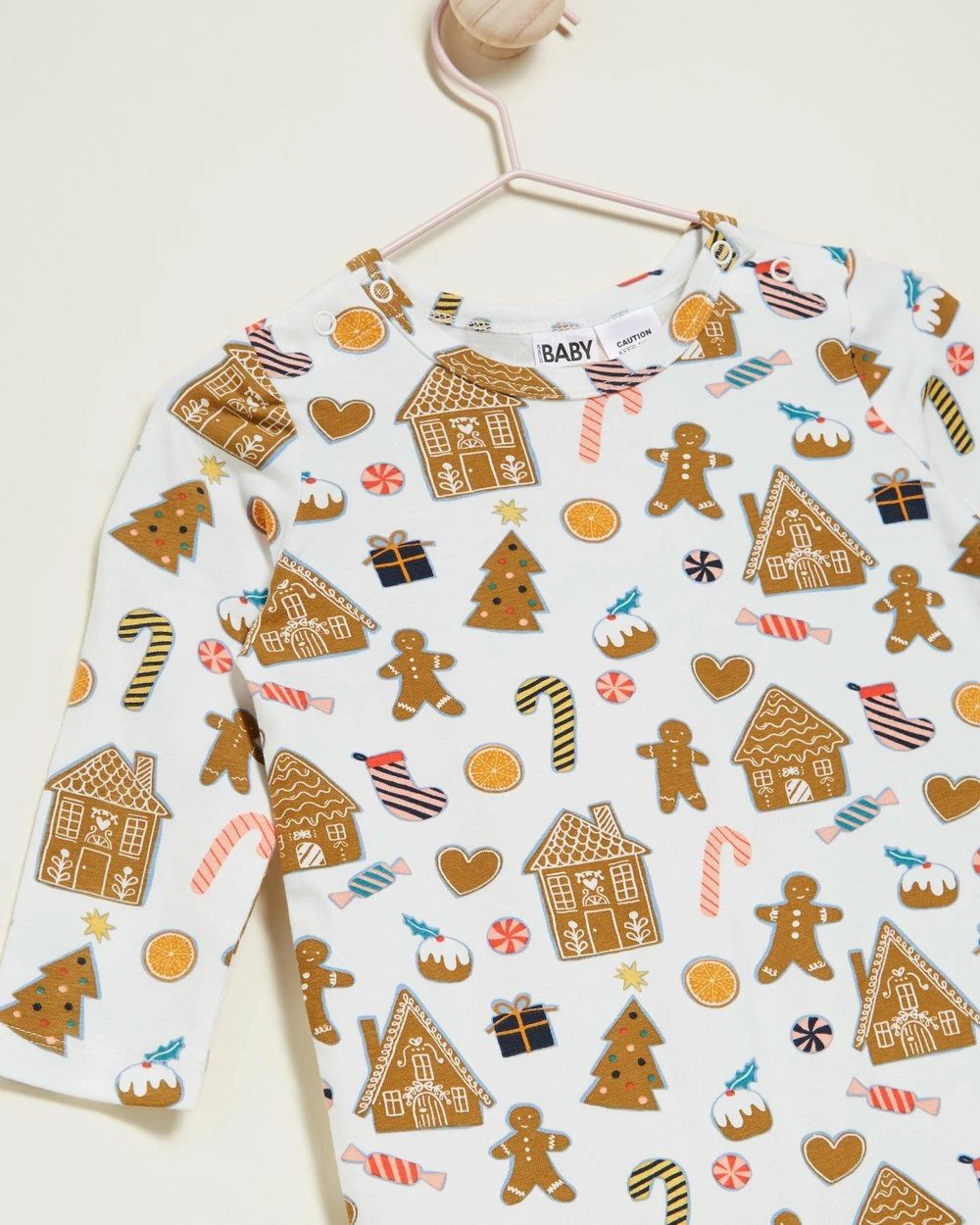 – Christmas print all over featuring gingerbread houses, puddings and candy canes