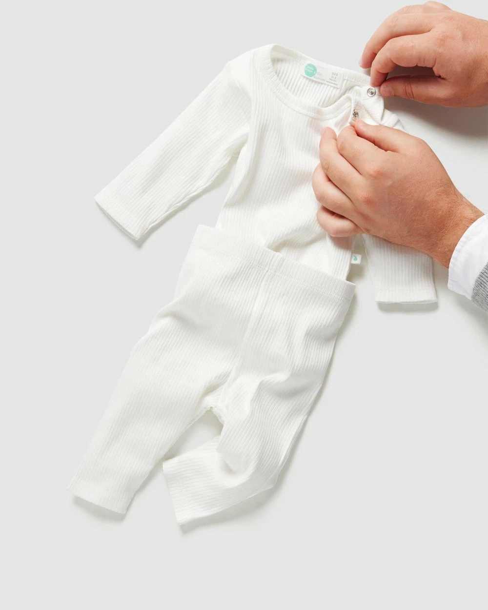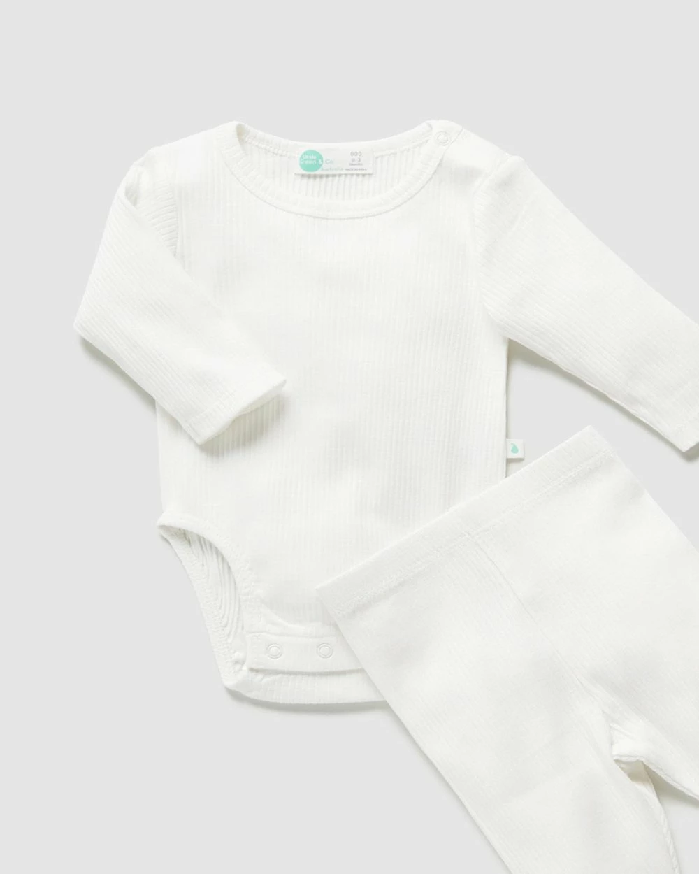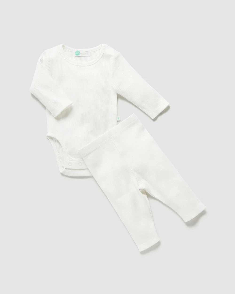 The Rib Long Sleeve Bodysuit & Leggings Set by Little Green & Co can be worn separately are layered together.