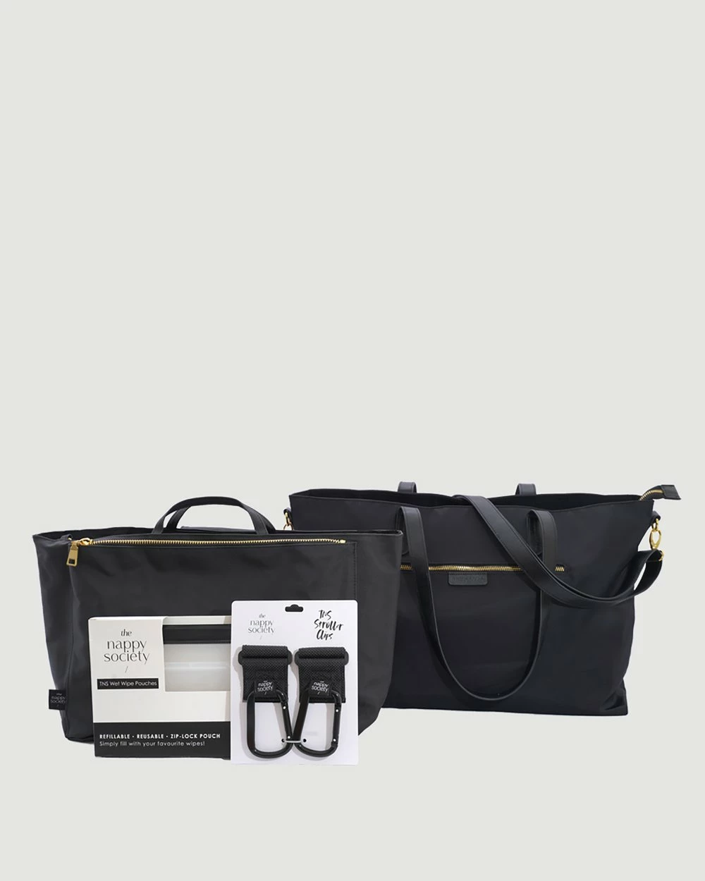 The Nappy Society Luxe Nylon Tote Bundle in black is the perfect take-anywhere, carry-all that will hold everything you need for motherhood and beyond. Paired with the Original Baby Bag Insert in Black, Stroller Clips and Wet Wipe Pouches; the Luxe Nylon Tote Bundle has all the essentials, making it the perfect baby bag.