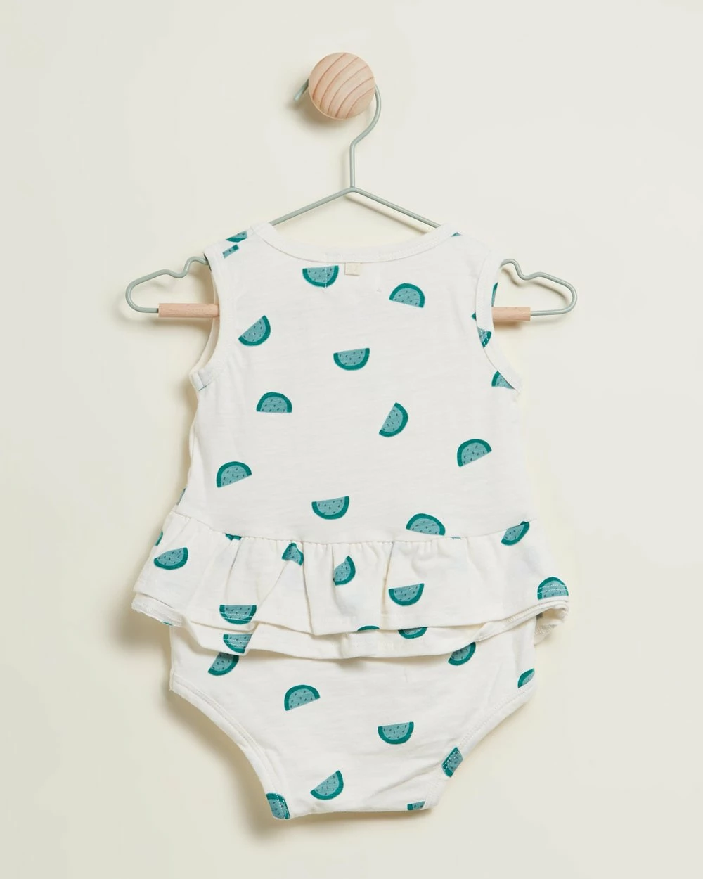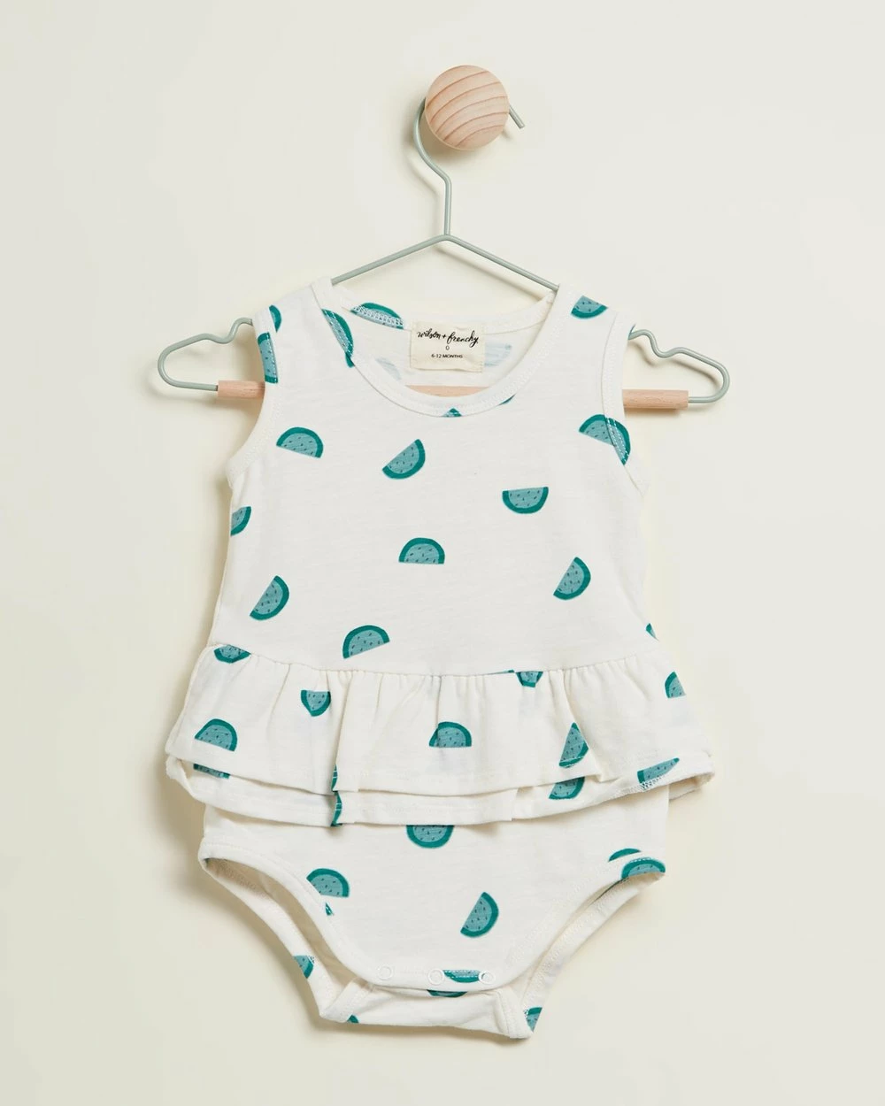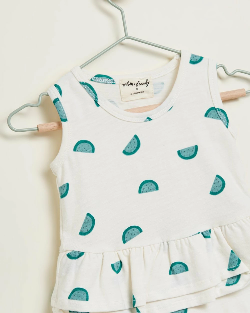 Adorned with ruffle trim to complement the watermelon pattern, Wilson & Frenchy‘s Organic Ruffle Bodysuit is an artful addition to their daytime wardrobe.