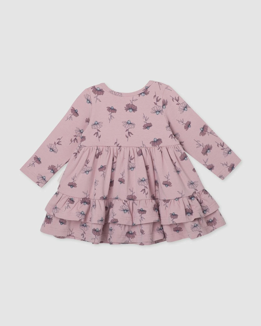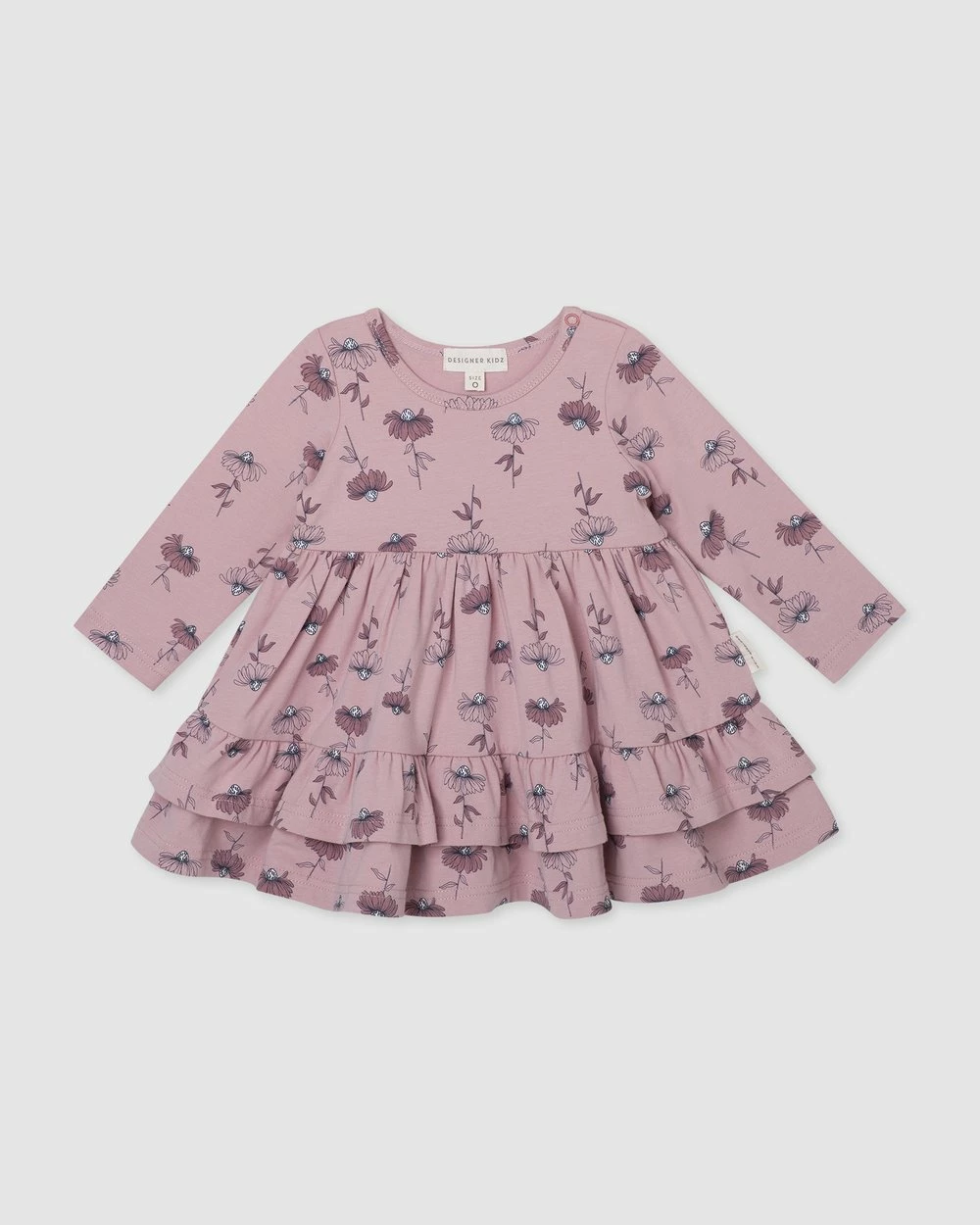 The Elsie Baby Dress by Designer Kidz features a vibrant nostalgia rose floral print on soft dusty pink jersey, long sleeves and two tier skirt. Designer Kidz is an Australian owned special occasion wear label.