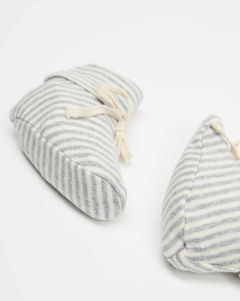 The Cotton Booties from Nature Baby NZ feature fold-down cuffs and decorative bows to the fronts.