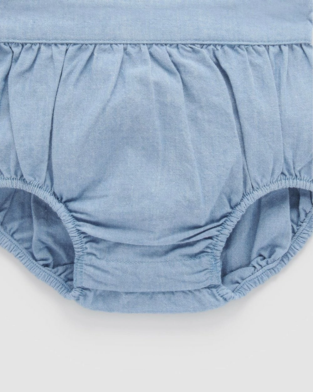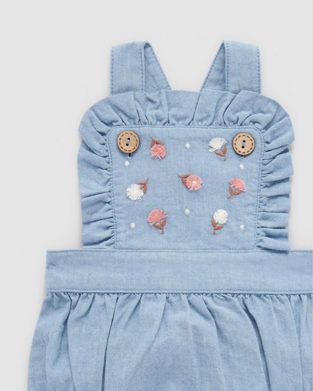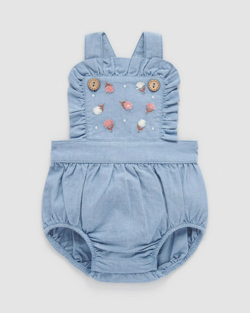 Lightweight and classic, the Chambray Bodysuit from Purebaby is perfect for those dressier occasions on warm summer days. Featuring sweet embroidered flowers at the chest and made from 100% Organic Cotton for a soft and breathable piece.