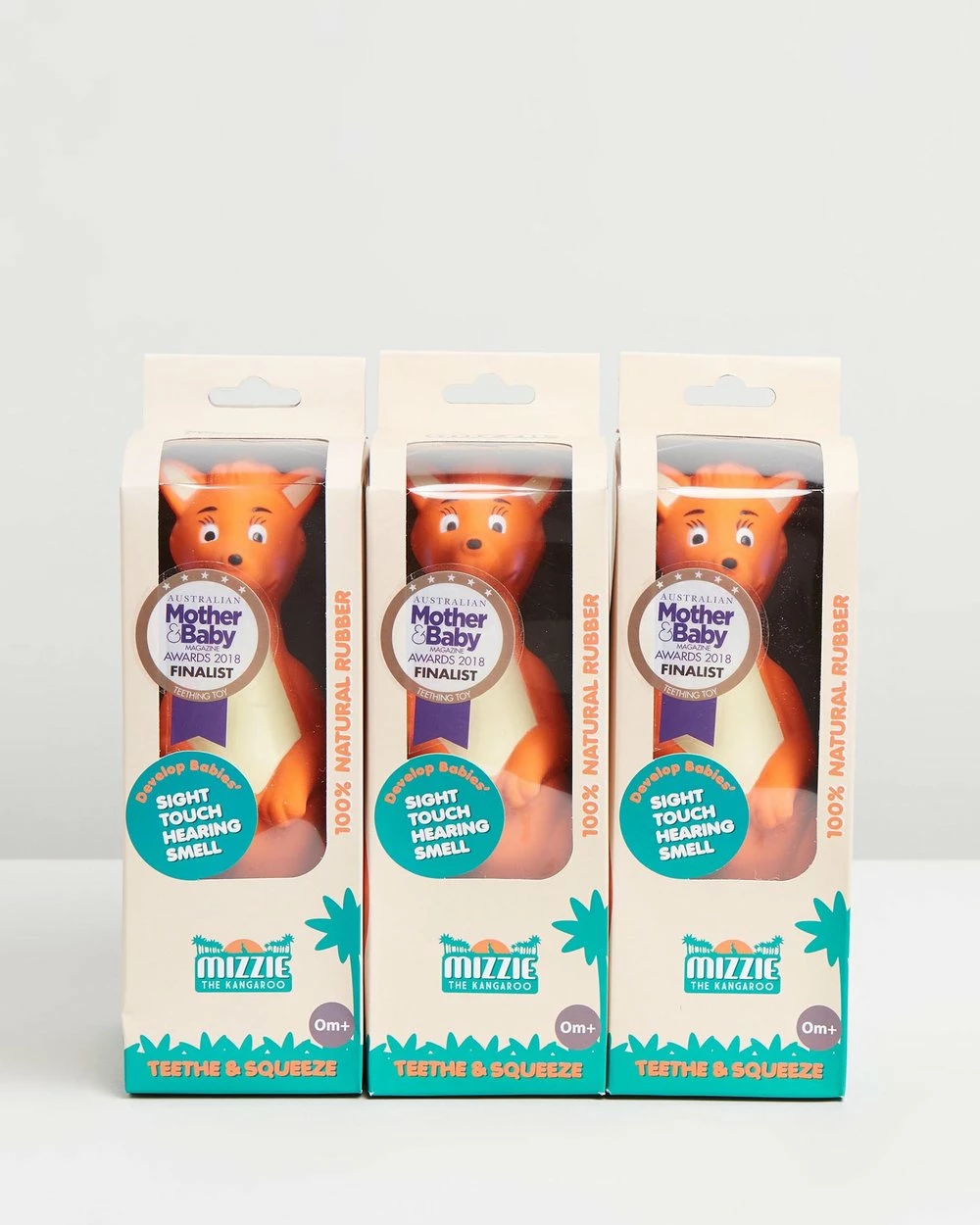 The Mizzie The Kangaroo Promo set features three teethe-and-squeeze kangaroos to keep your little one entertained and soothe their gums, built from 100% natural rubber and designed by parents for a non-toxic, natural remedy for teething babies and toddlers.