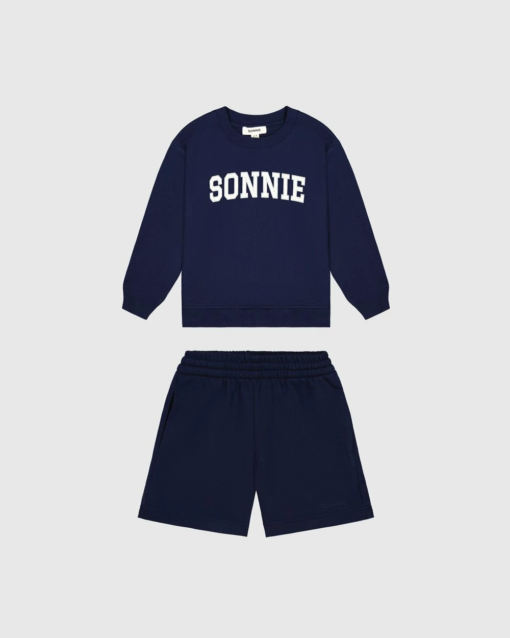 A 2-piece set of Sonnie’s Varsity Crewneck and Earl Sweat Shorts. Cut in 100% GOTS certified organic cotton French Terry.