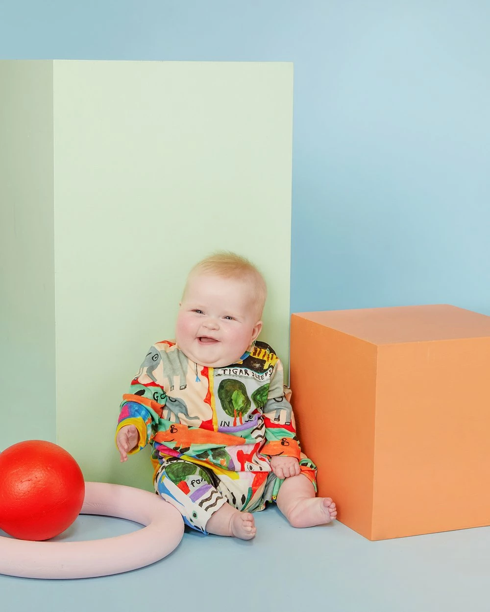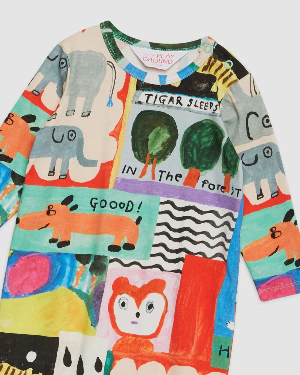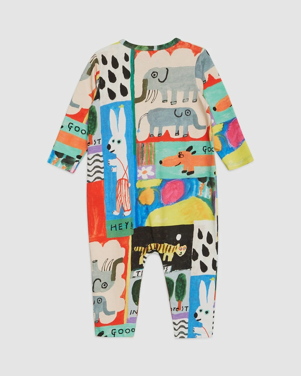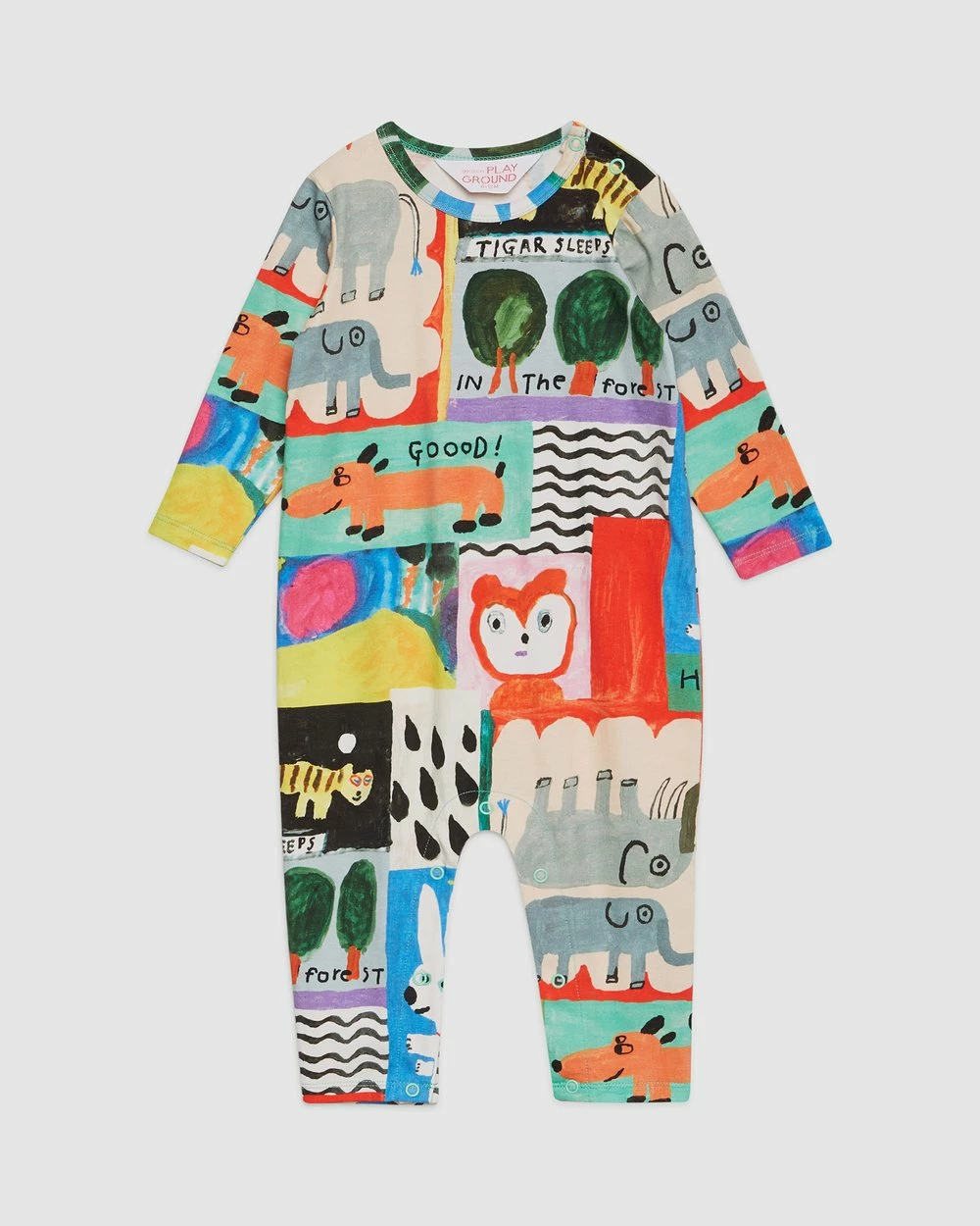 The Puzzle Baby Onesie by Gorman Playground is a printed organic cotton jersey baby onesie. This onesie has a round neckline, press snaps at gusset and shoulders, organic cotton elastane jersey fabrication, long sleeves, full length leg and an exclusive mogu takahashi x gorman playground print.