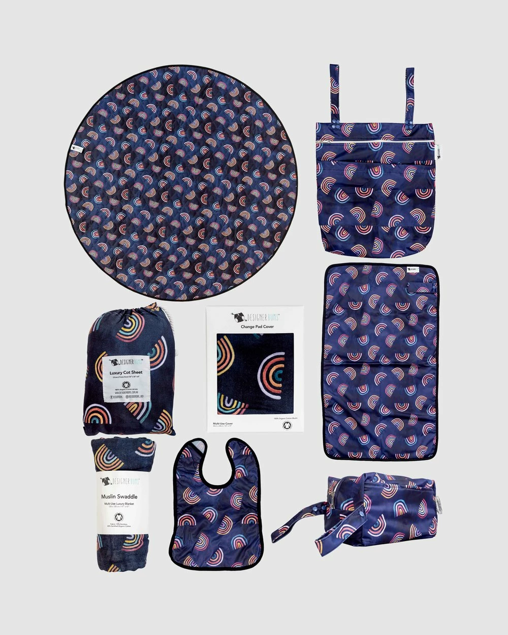 – Gorgeous hand-illustrated designs allowing you to customize your little ones room- Made from soft and luxurious materials to provide a safe and gentle surface for your little one to rest on- The Designer Bums 8 Piece Nursery Set includes a Swaddle, Bib, Regular Wet Bag, Travel Wet Bag, Change Pad Cover, Cot Sheet, Change Mat, Play Mat- Australian owned and designed for over a decade