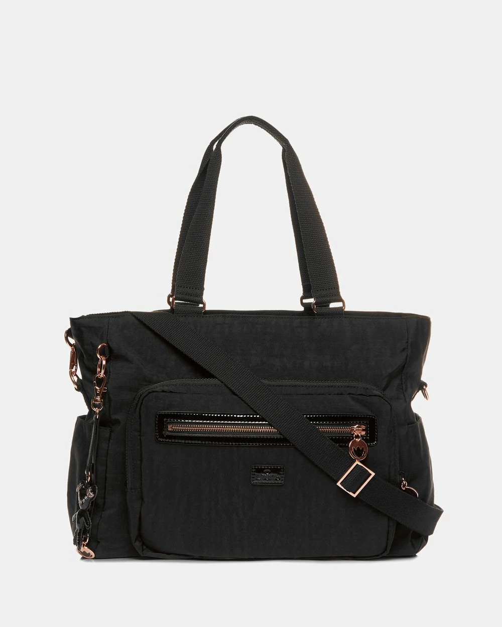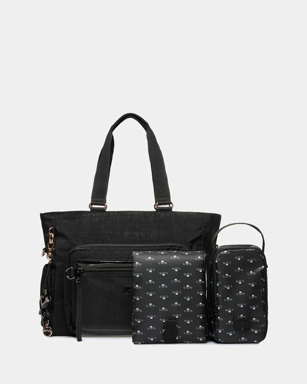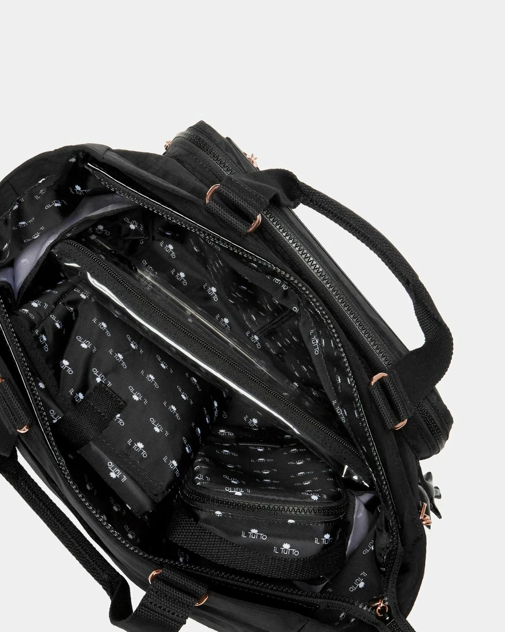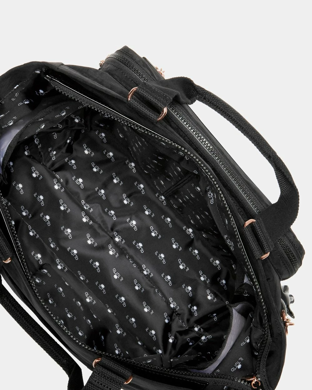 Layla Nappy Bag from Il Tutto will be your new best friend. Designed to be light weight and super stylish. With accents of rose gold and black patent details to always give you that chic style. Layla has every feature to keep you organized while out with your baby, or even at the gym or a weekend away. Features Il Tutto logo print lining and designed to be light weight so itโs easy to carry on your shoulder even when fully packed with all your daily essentials. Included in the bag is the signature logo Baby Change mat, bottle/food warmer pack and a zip closure wet-pack.