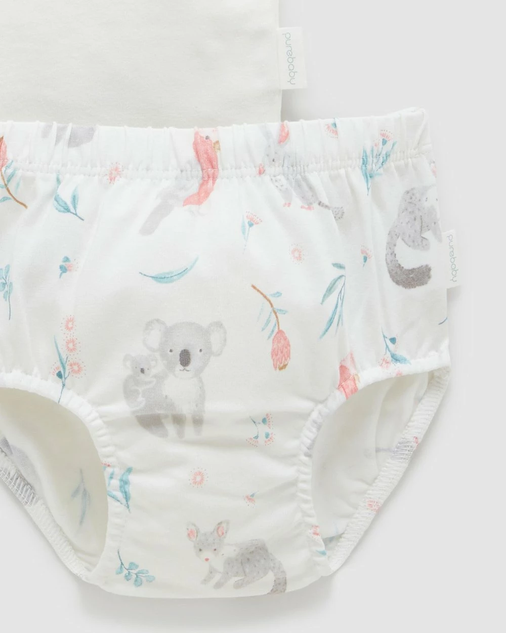 Purebaby’s 3 piece Baby Gift Hamper is thoughtfully designed with gifting in mind as part of their lovely Australiana range. Consisting of a short sleeve top with a possum illustration at the chest, a native animal print nappy cover and a sweet Possum Rattle.