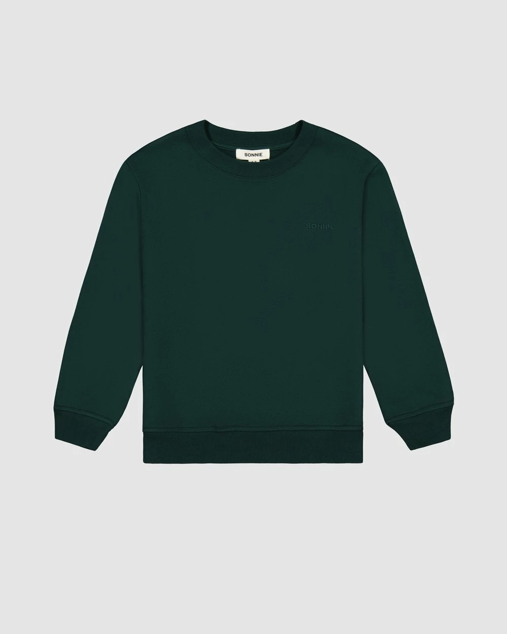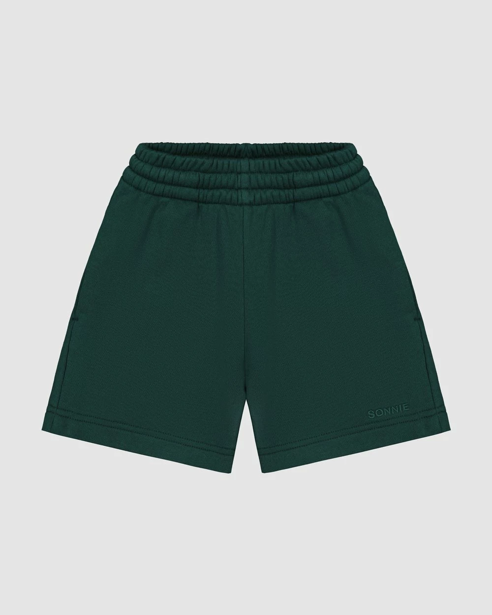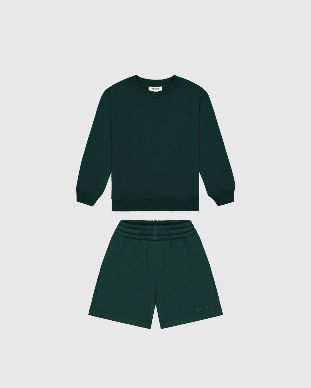 Sonnie’s 100% GOTS certified organic cotton Tama Crewneck Sweatshirt and Earl Sweat Shorts set in forest green.