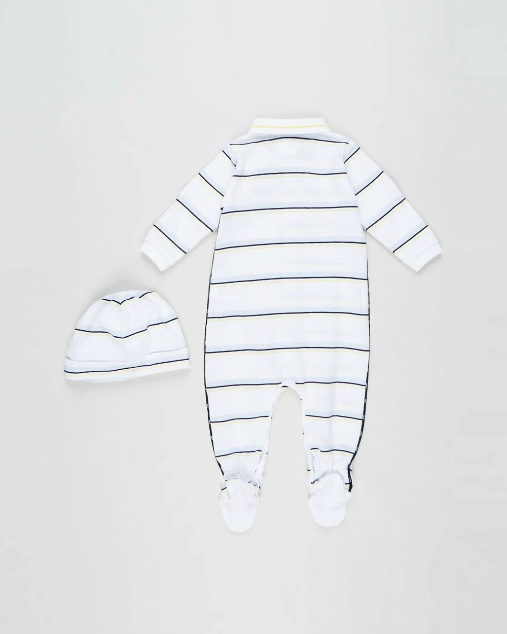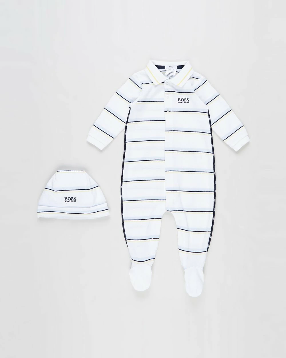 Luxury fashion powerhouse BOSS creates the ultimate tiny duo with the Striped Romper & Beanie Set. Crafted from pure cotton pique with a trendy striped beanie to match the all in one ensemble.