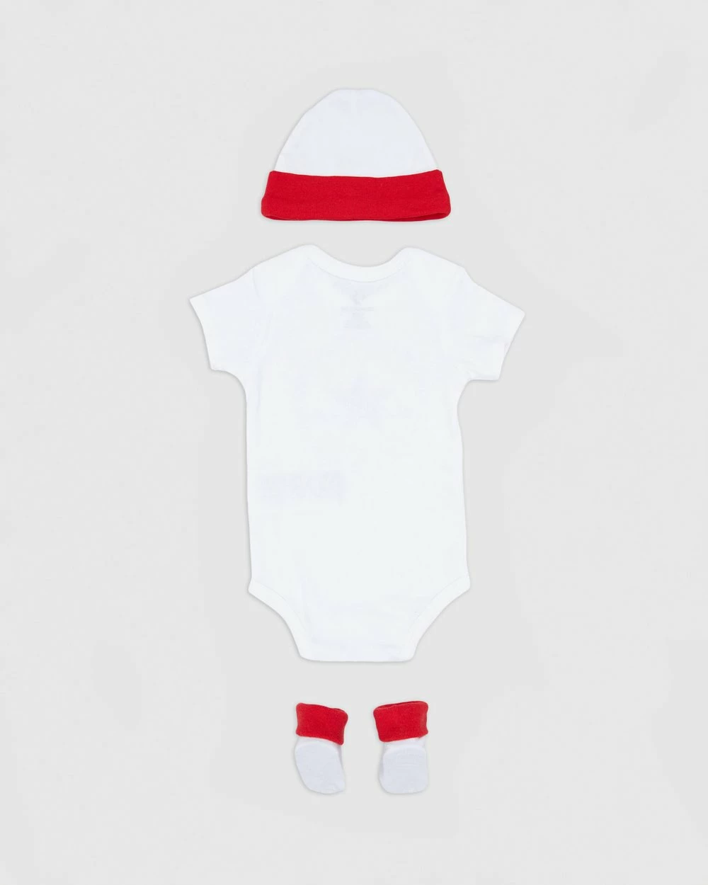 – Folded cuff with blue embroidered branding on beanie hat and socks