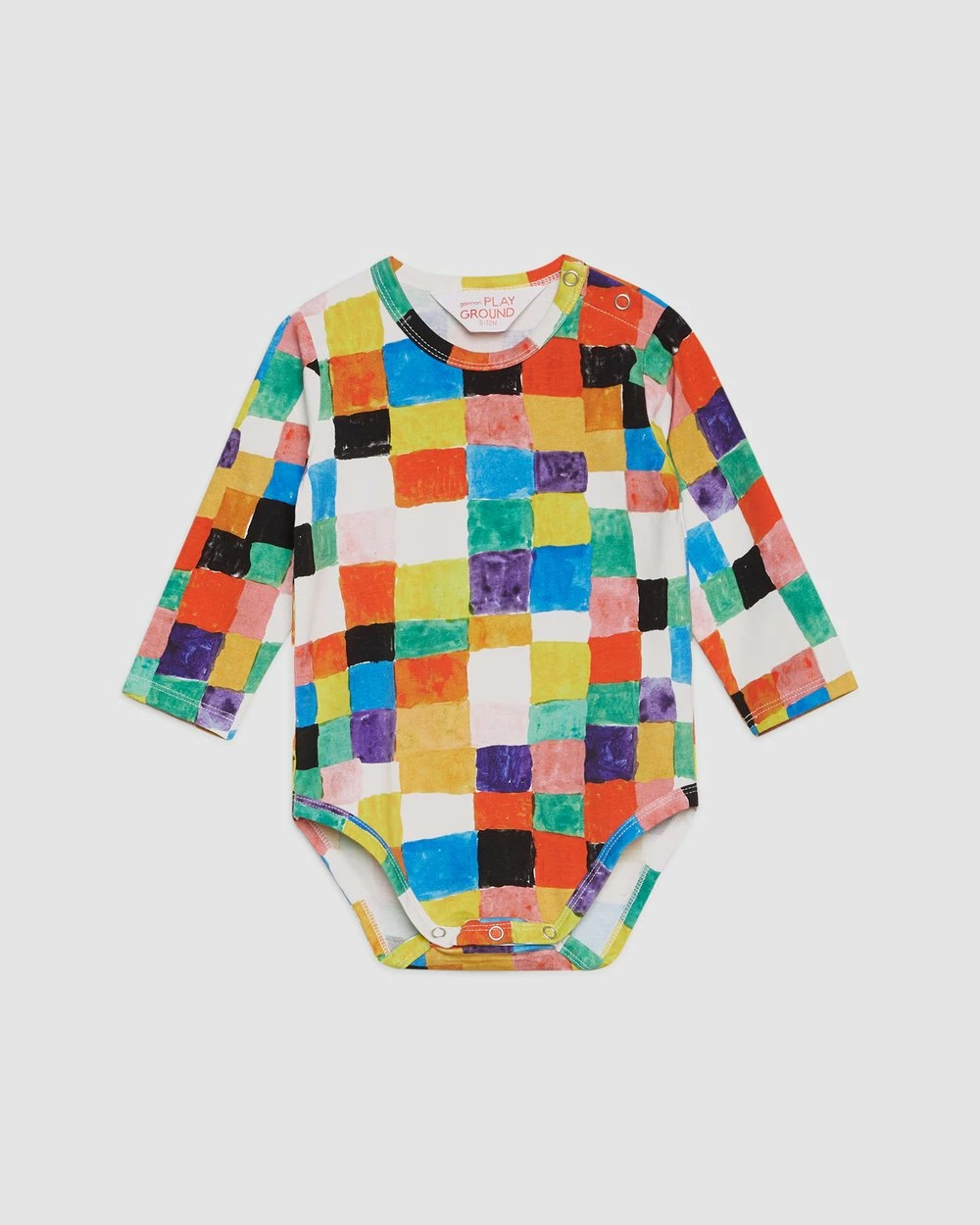 The Seven Colours Baby Onesie by Gorman Playground is a printed organic cotton jersey baby onesie. This onesie has a round neckline, press snaps at gusset and shoulders, organic cotton and elastane jersey fabrication, long sleeves and an exclusive gorman playground x mogu takahashi print.