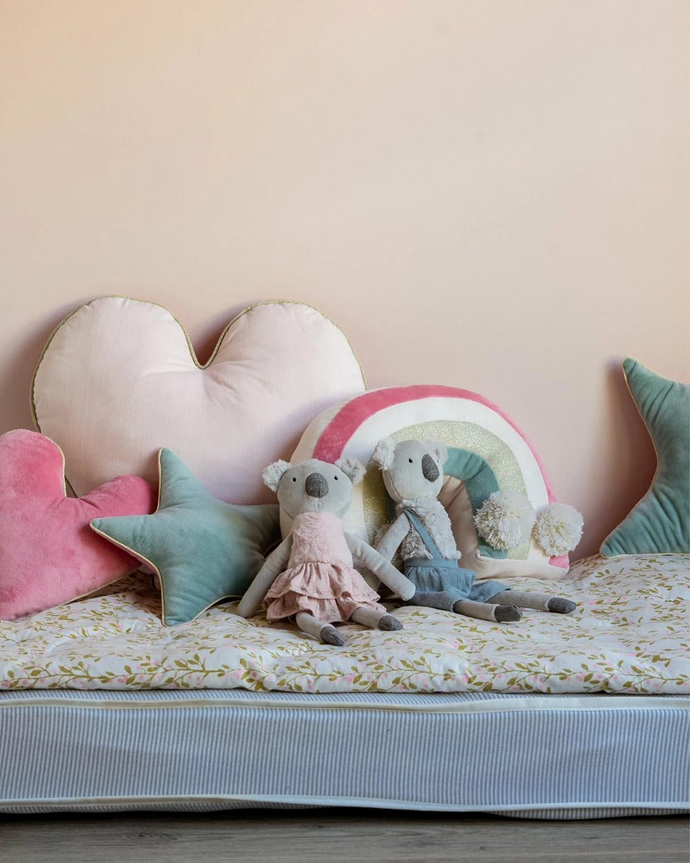 Nana Huchy’s pretty Dream Big Rainbow Cushion features soft soothing, raspberry pinks and turquoise greens. With its velour texture and gorgeous pom-pom detail, this reversible rainbow will be well-placed as the hero on any bed.