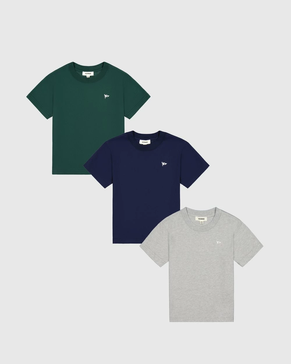 A 3-pack of the classic Bobby Tee. A relaxed drop shoulder short-sleeve t-shirt with Sonnie’s signature flag embroidery at the chest. These 100% GOTS certified organic cotton unisex kids’ tees are a must-have summer staple.
