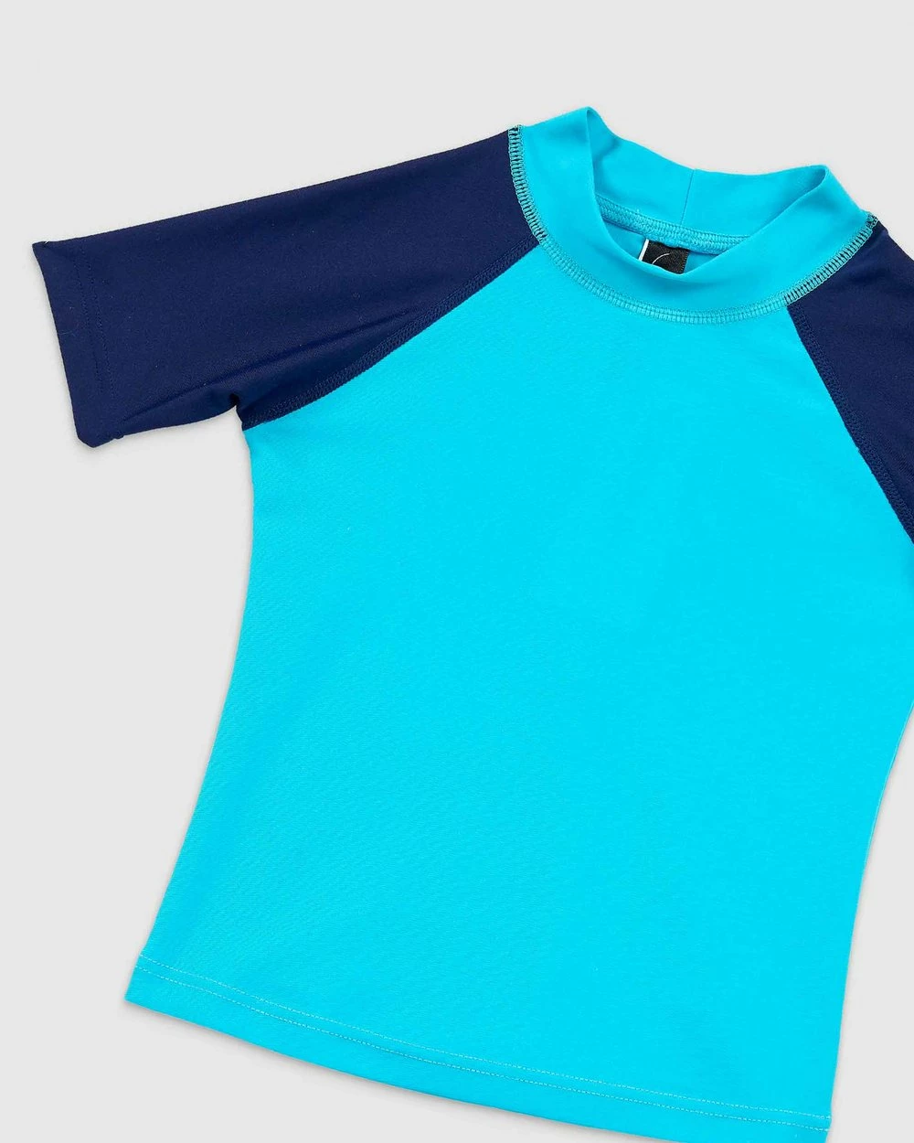 With a high collar and colour-blocked design, the Building Blocks Short Sleeve Rash Vest from Aqua Blu Kids is a classic addition to their swimwear collection.