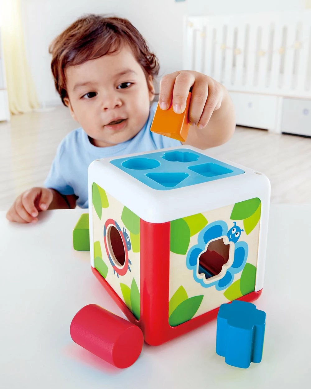 Combining learning and fun, the Shape Sorting Box from Hape is an easy way to teach your little one about different shapes by fitting them into the matching holes.